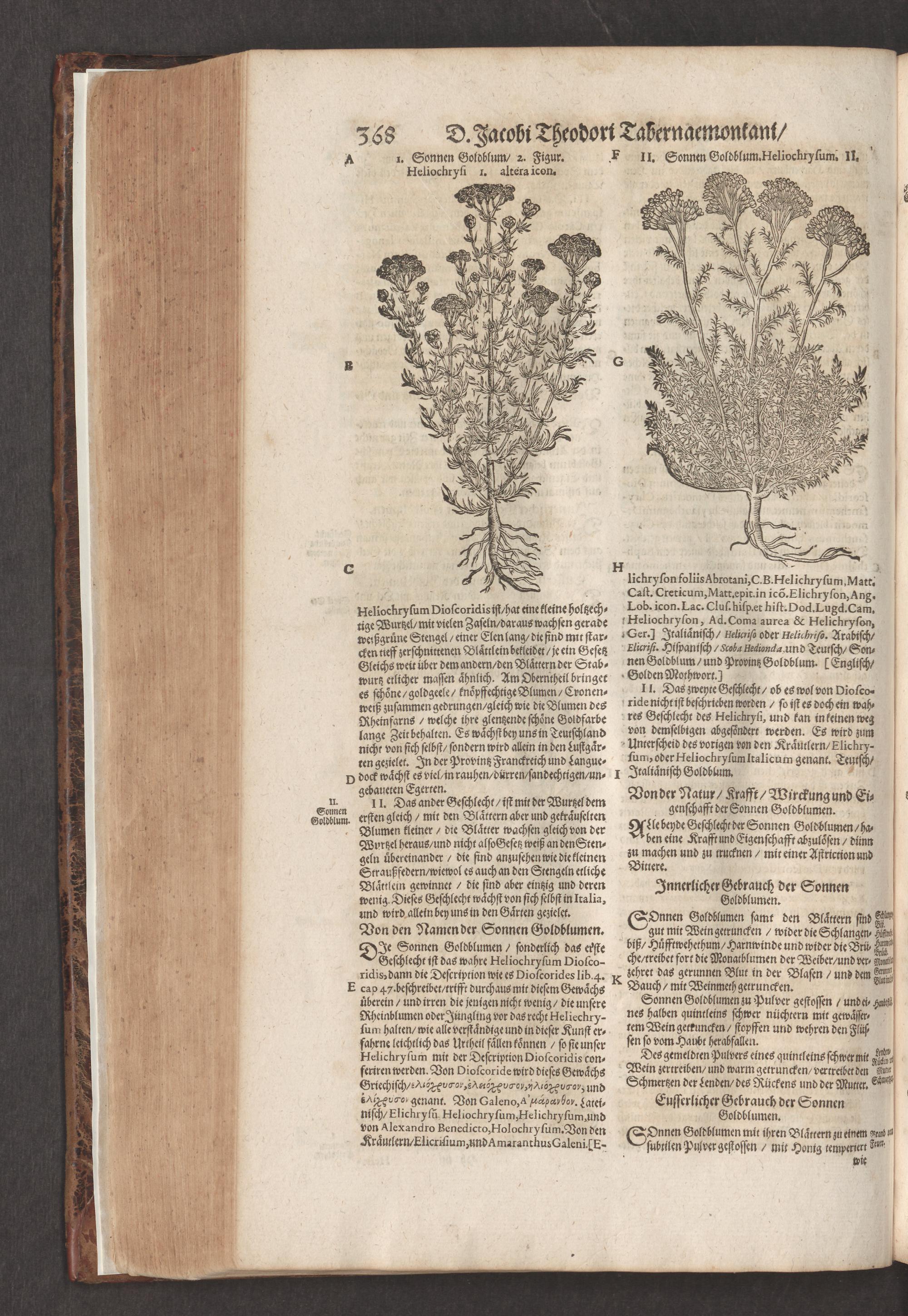D. Jacobi Theodori Tabernaemontani, Neu vollkommen Kräuter-Buch : Darinnen Uber 3000. Kräuter/ mit schönen und kunstlichen Figuren/ auch deren Underscheid und Würckung/ samt ihren Namen in mancherley Sprachen/ beschrieben: Desgleichen auch/ wie dieselbige in allerhand Kranckheiten/ beyde der Menschen und des Viehs/ sollen angewendet und gebraucht werden/ angezeigt wird. Erstlichen durch Casparum Bauhinum D. und Profess. Basil. mit vielen neuen Figuren/ nutzlichen Artzneyen/ und anderem/ mit sonderem Fleis gebesseret/ Zum Andern Durch Hieronymum Bauhinum D. und Profess. Basil. mit sehr nutzlichen Marginalien, Synonimis, neuen Registeren und anderem vermehrt