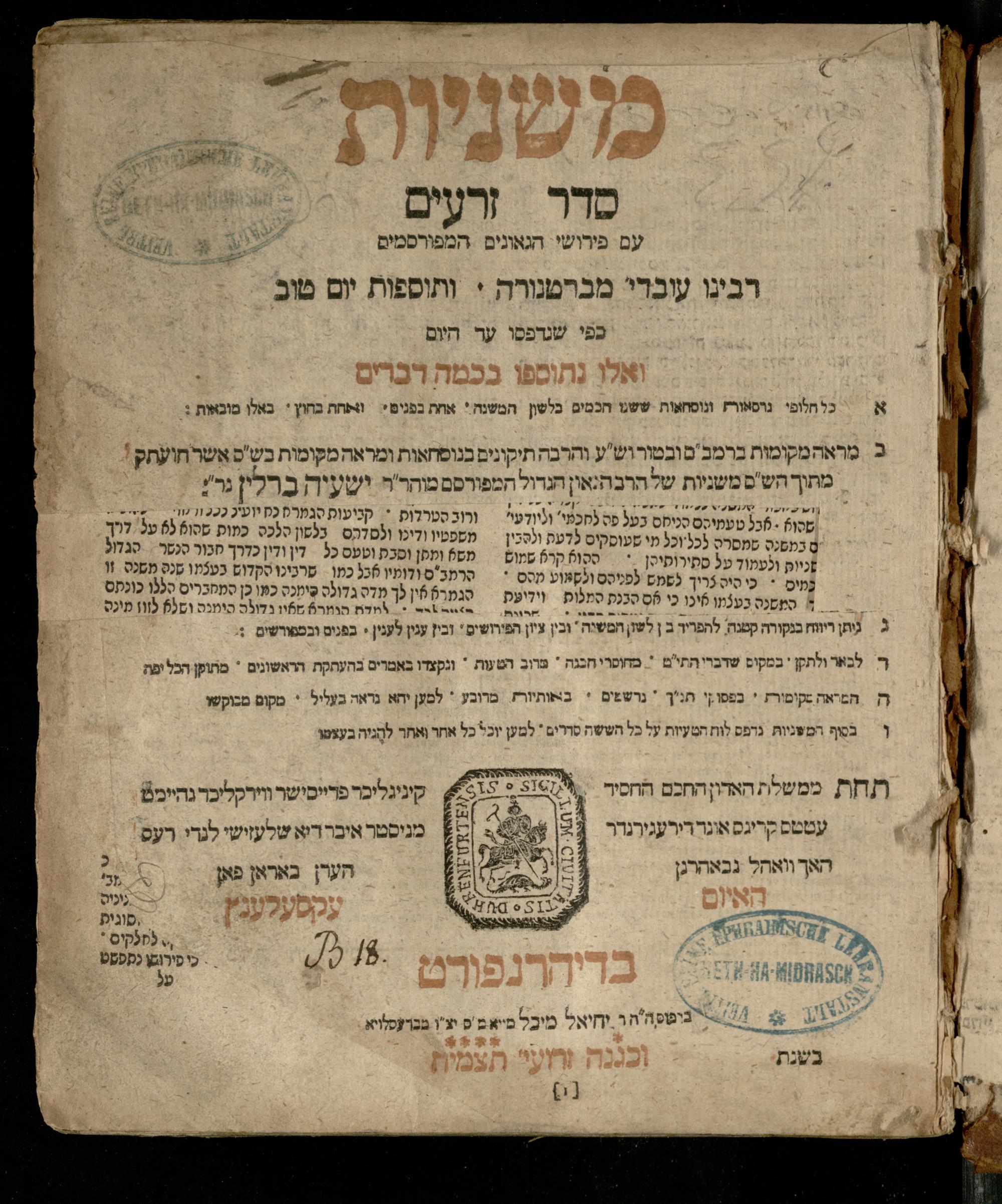 1 (1783) Seder Zeraʿim / Yeshaʿya Berlin be-shem Rishon le-Tsiyon1 (1783) סדר זרעים / ישעי ברלין בשם ראשון לציון