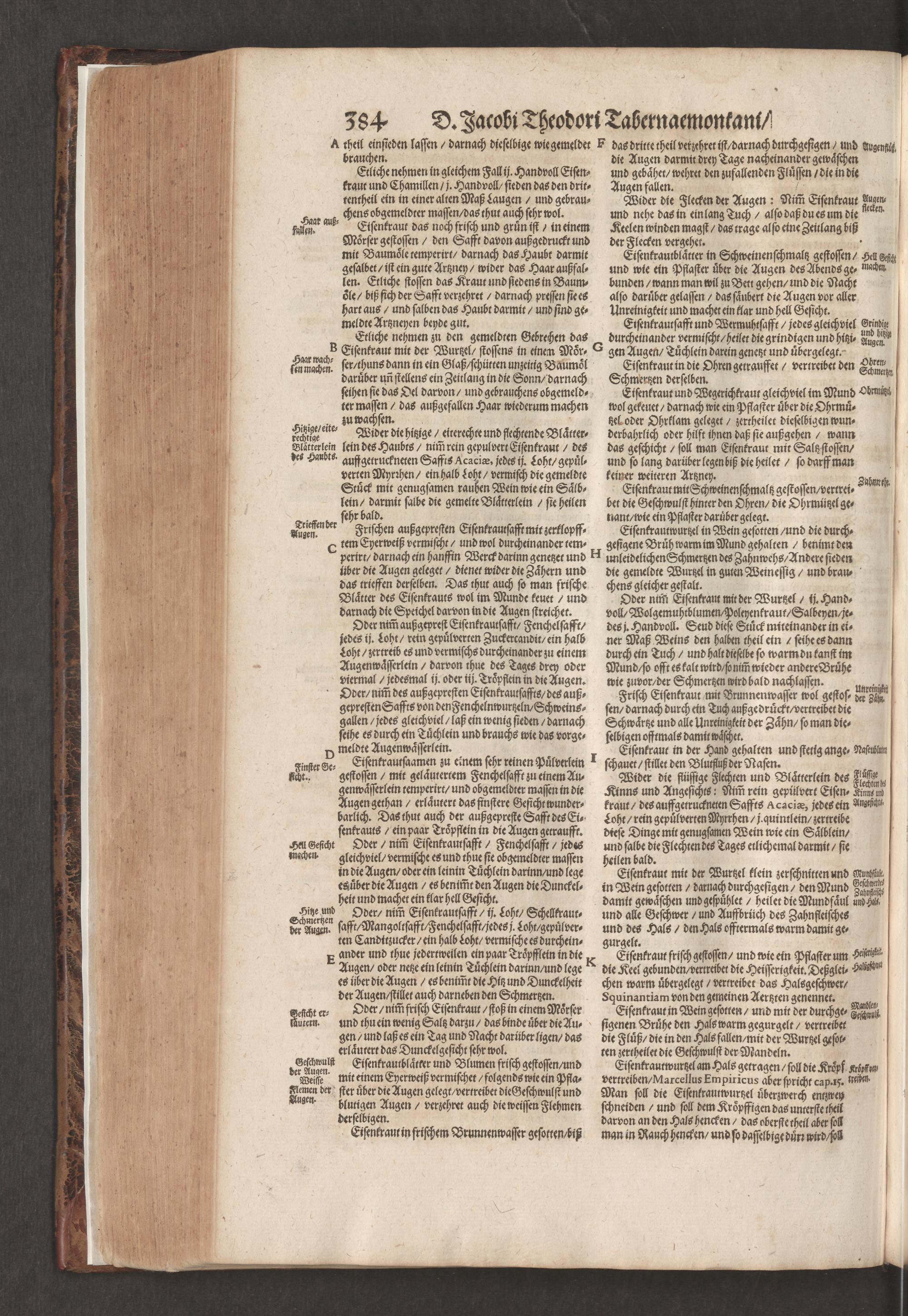 D. Jacobi Theodori Tabernaemontani, Neu vollkommen Kräuter-Buch : Darinnen Uber 3000. Kräuter/ mit schönen und kunstlichen Figuren/ auch deren Underscheid und Würckung/ samt ihren Namen in mancherley Sprachen/ beschrieben: Desgleichen auch/ wie dieselbige in allerhand Kranckheiten/ beyde der Menschen und des Viehs/ sollen angewendet und gebraucht werden/ angezeigt wird. Erstlichen durch Casparum Bauhinum D. und Profess. Basil. mit vielen neuen Figuren/ nutzlichen Artzneyen/ und anderem/ mit sonderem Fleis gebesseret/ Zum Andern Durch Hieronymum Bauhinum D. und Profess. Basil. mit sehr nutzlichen Marginalien, Synonimis, neuen Registeren und anderem vermehrt