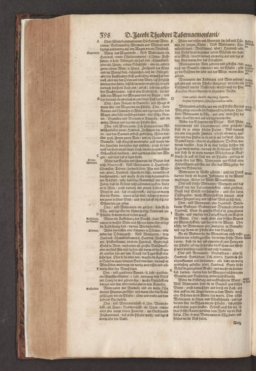 D. Jacobi Theodori Tabernaemontani, Neu vollkommen Kräuter-Buch : Darinnen Uber 3000. Kräuter/ mit schönen und kunstlichen Figuren/ auch deren Underscheid und Würckung/ samt ihren Namen in mancherley Sprachen/ beschrieben: Desgleichen auch/ wie dieselbige in allerhand Kranckheiten/ beyde der Menschen und des Viehs/ sollen angewendet und gebraucht werden/ angezeigt wird. Erstlichen durch Casparum Bauhinum D. und Profess. Basil. mit vielen neuen Figuren/ nutzlichen Artzneyen/ und anderem/ mit sonderem Fleis gebesseret/ Zum Andern Durch Hieronymum Bauhinum D. und Profess. Basil. mit sehr nutzlichen Marginalien, Synonimis, neuen Registeren und anderem vermehrt