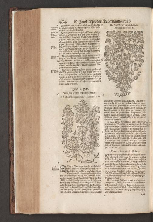 D. Jacobi Theodori Tabernaemontani, Neu vollkommen Kräuter-Buch : Darinnen Uber 3000. Kräuter/ mit schönen und kunstlichen Figuren/ auch deren Underscheid und Würckung/ samt ihren Namen in mancherley Sprachen/ beschrieben: Desgleichen auch/ wie dieselbige in allerhand Kranckheiten/ beyde der Menschen und des Viehs/ sollen angewendet und gebraucht werden/ angezeigt wird. Erstlichen durch Casparum Bauhinum D. und Profess. Basil. mit vielen neuen Figuren/ nutzlichen Artzneyen/ und anderem/ mit sonderem Fleis gebesseret/ Zum Andern Durch Hieronymum Bauhinum D. und Profess. Basil. mit sehr nutzlichen Marginalien, Synonimis, neuen Registeren und anderem vermehrt