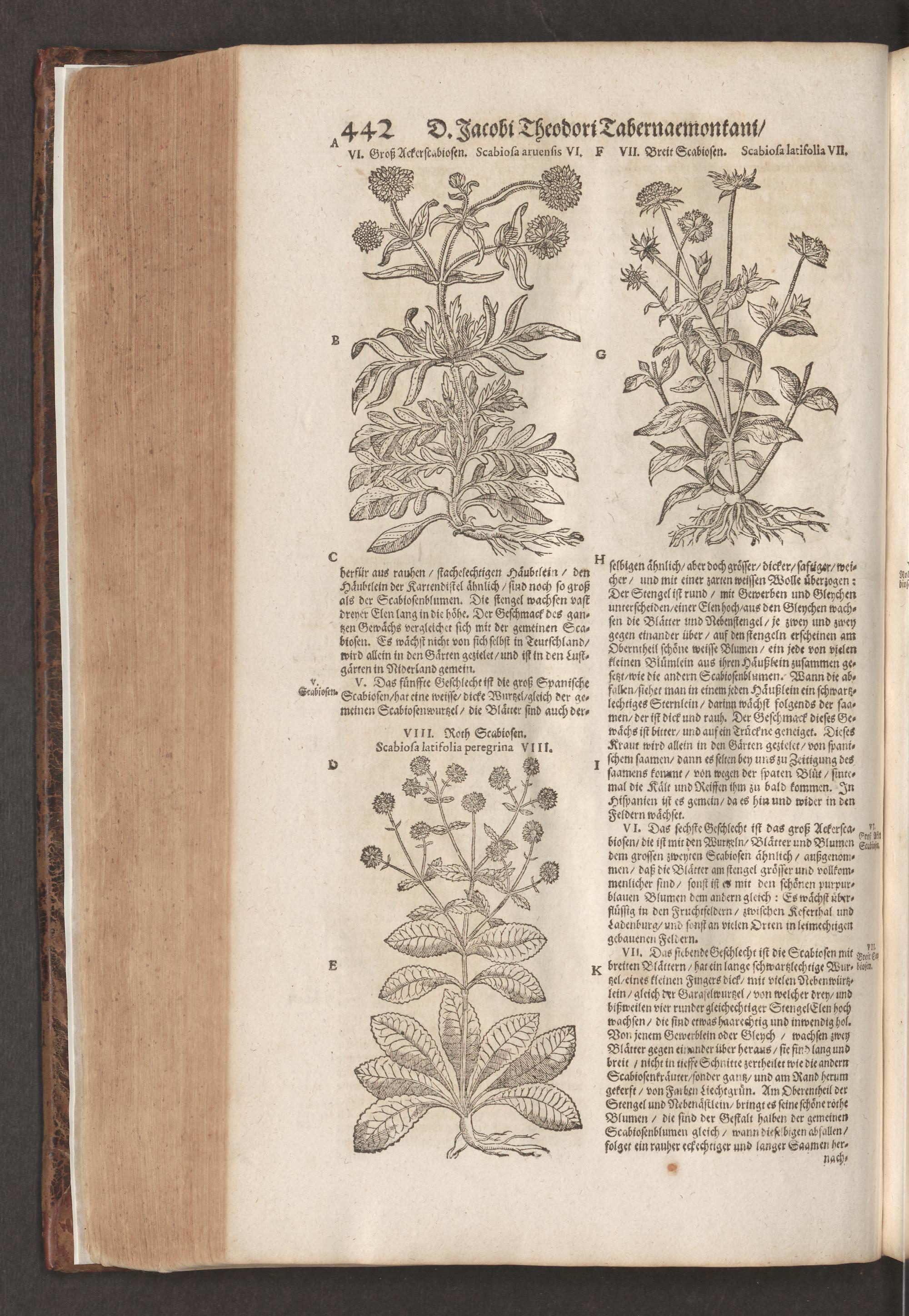 D. Jacobi Theodori Tabernaemontani, Neu vollkommen Kräuter-Buch : Darinnen Uber 3000. Kräuter/ mit schönen und kunstlichen Figuren/ auch deren Underscheid und Würckung/ samt ihren Namen in mancherley Sprachen/ beschrieben: Desgleichen auch/ wie dieselbige in allerhand Kranckheiten/ beyde der Menschen und des Viehs/ sollen angewendet und gebraucht werden/ angezeigt wird. Erstlichen durch Casparum Bauhinum D. und Profess. Basil. mit vielen neuen Figuren/ nutzlichen Artzneyen/ und anderem/ mit sonderem Fleis gebesseret/ Zum Andern Durch Hieronymum Bauhinum D. und Profess. Basil. mit sehr nutzlichen Marginalien, Synonimis, neuen Registeren und anderem vermehrt