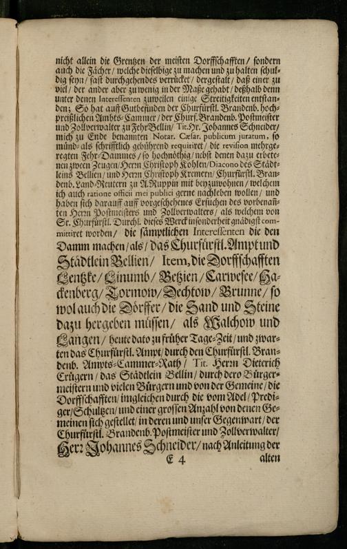 Beschreibung Des Fehr-Dammes Zu FehrBellin : 1. Wie lang der Fehr-Damm ... erhalten werden muß. 2. Wer die Materialien an Sand und Steinen ... lassen muß. 3. Welchie die Anfuhre zu thun schuldig. 4. Auch welche bey Erbawung der Brücke Hand-Dienste thun müssen. 5. Und welche dahingegen von dem Brükken-Gelde befreyet seyn / Beschrieben in Anno 1645. durch den domaligen Churfürstl. Amptschreiber Herr Johann Kochen. In Anno 1664. Revidiret/ durch die domalige Beampte/ mit Zuziehung des Zollverwalters/ Johann Schneiders. Und in Anno 1680. abermal Revidiret ... und wieder in richtigen Stand gebracht ...
