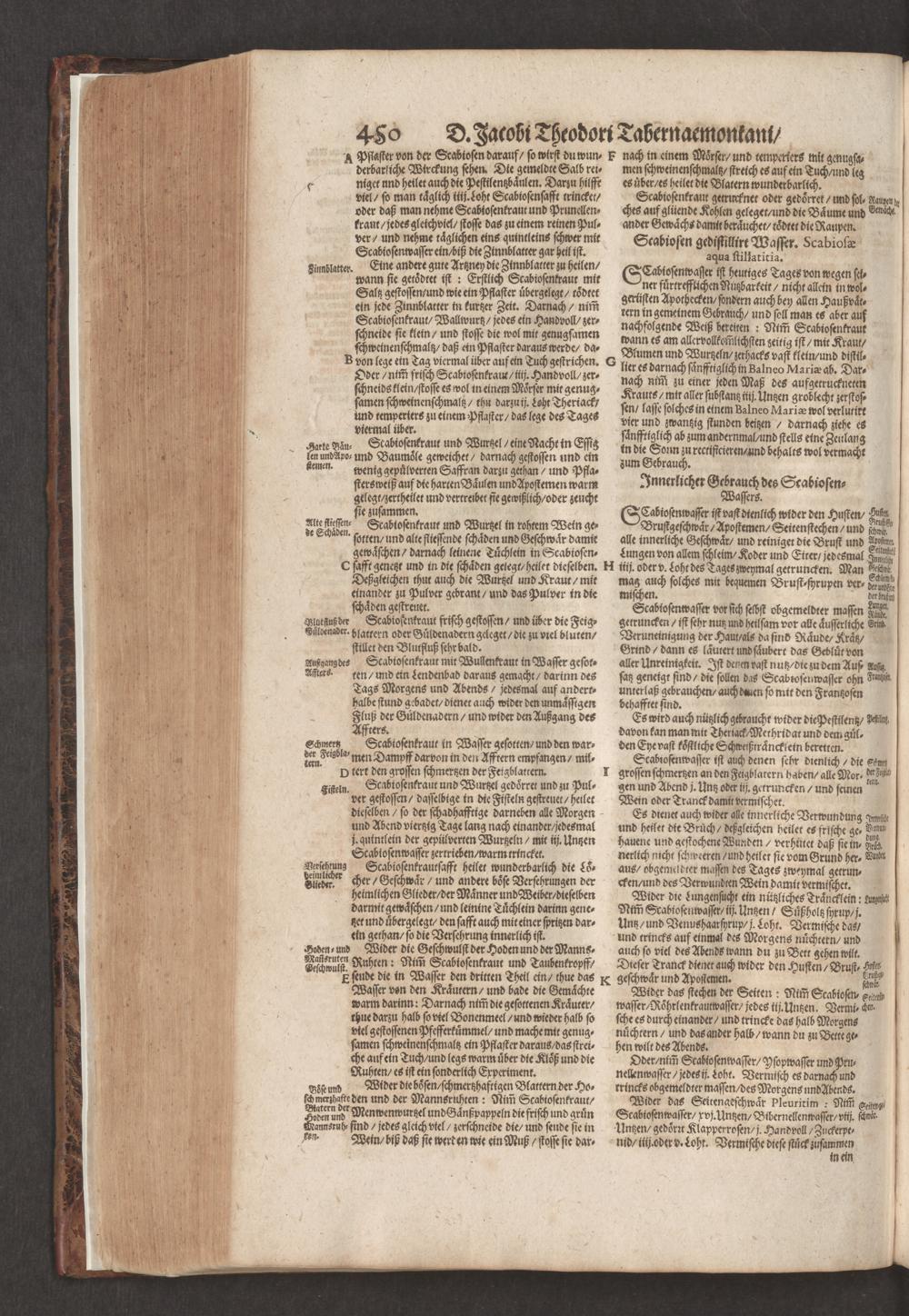 D. Jacobi Theodori Tabernaemontani, Neu vollkommen Kräuter-Buch : Darinnen Uber 3000. Kräuter/ mit schönen und kunstlichen Figuren/ auch deren Underscheid und Würckung/ samt ihren Namen in mancherley Sprachen/ beschrieben: Desgleichen auch/ wie dieselbige in allerhand Kranckheiten/ beyde der Menschen und des Viehs/ sollen angewendet und gebraucht werden/ angezeigt wird. Erstlichen durch Casparum Bauhinum D. und Profess. Basil. mit vielen neuen Figuren/ nutzlichen Artzneyen/ und anderem/ mit sonderem Fleis gebesseret/ Zum Andern Durch Hieronymum Bauhinum D. und Profess. Basil. mit sehr nutzlichen Marginalien, Synonimis, neuen Registeren und anderem vermehrt