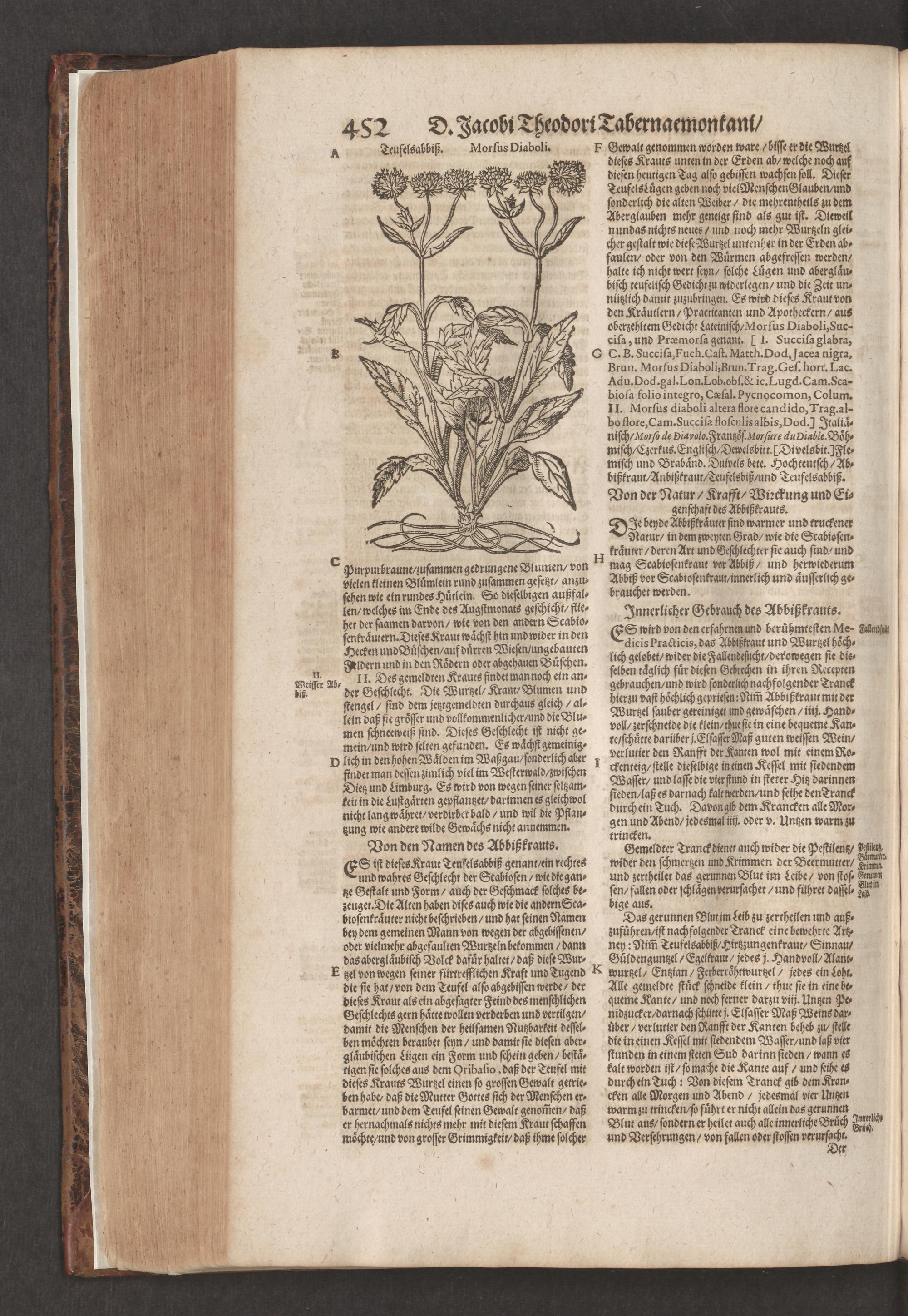 D. Jacobi Theodori Tabernaemontani, Neu vollkommen Kräuter-Buch : Darinnen Uber 3000. Kräuter/ mit schönen und kunstlichen Figuren/ auch deren Underscheid und Würckung/ samt ihren Namen in mancherley Sprachen/ beschrieben: Desgleichen auch/ wie dieselbige in allerhand Kranckheiten/ beyde der Menschen und des Viehs/ sollen angewendet und gebraucht werden/ angezeigt wird. Erstlichen durch Casparum Bauhinum D. und Profess. Basil. mit vielen neuen Figuren/ nutzlichen Artzneyen/ und anderem/ mit sonderem Fleis gebesseret/ Zum Andern Durch Hieronymum Bauhinum D. und Profess. Basil. mit sehr nutzlichen Marginalien, Synonimis, neuen Registeren und anderem vermehrt