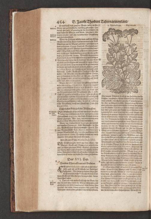 D. Jacobi Theodori Tabernaemontani, Neu vollkommen Kräuter-Buch : Darinnen Uber 3000. Kräuter/ mit schönen und kunstlichen Figuren/ auch deren Underscheid und Würckung/ samt ihren Namen in mancherley Sprachen/ beschrieben: Desgleichen auch/ wie dieselbige in allerhand Kranckheiten/ beyde der Menschen und des Viehs/ sollen angewendet und gebraucht werden/ angezeigt wird. Erstlichen durch Casparum Bauhinum D. und Profess. Basil. mit vielen neuen Figuren/ nutzlichen Artzneyen/ und anderem/ mit sonderem Fleis gebesseret/ Zum Andern Durch Hieronymum Bauhinum D. und Profess. Basil. mit sehr nutzlichen Marginalien, Synonimis, neuen Registeren und anderem vermehrt