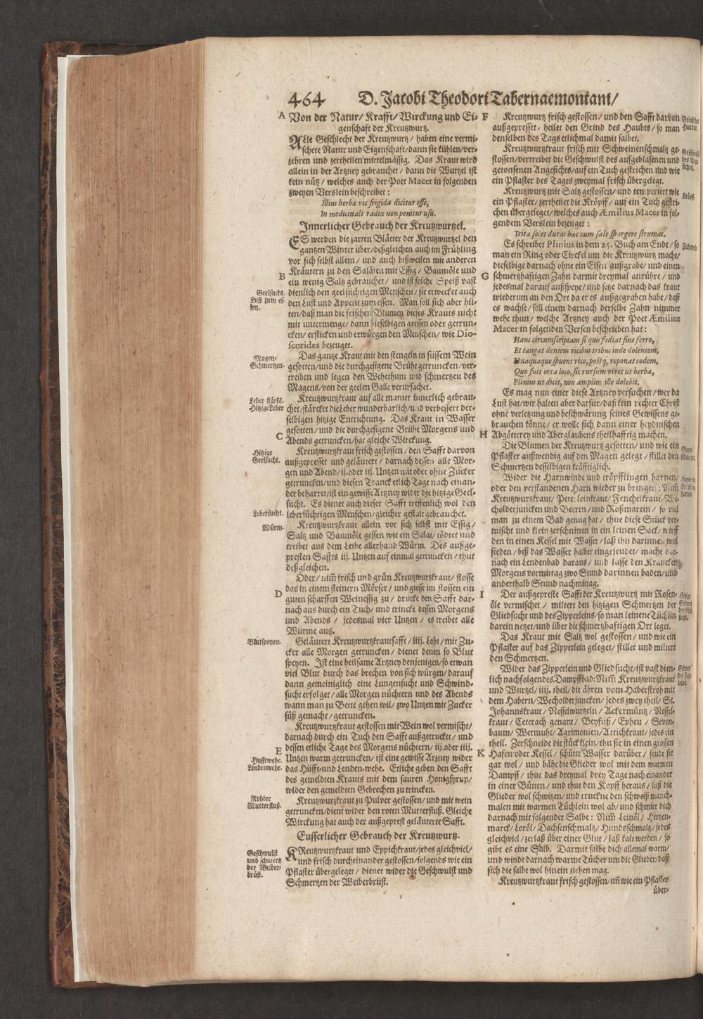 D. Jacobi Theodori Tabernaemontani, Neu vollkommen Kräuter-Buch : Darinnen Uber 3000. Kräuter/ mit schönen und kunstlichen Figuren/ auch deren Underscheid und Würckung/ samt ihren Namen in mancherley Sprachen/ beschrieben: Desgleichen auch/ wie dieselbige in allerhand Kranckheiten/ beyde der Menschen und des Viehs/ sollen angewendet und gebraucht werden/ angezeigt wird. Erstlichen durch Casparum Bauhinum D. und Profess. Basil. mit vielen neuen Figuren/ nutzlichen Artzneyen/ und anderem/ mit sonderem Fleis gebesseret/ Zum Andern Durch Hieronymum Bauhinum D. und Profess. Basil. mit sehr nutzlichen Marginalien, Synonimis, neuen Registeren und anderem vermehrt