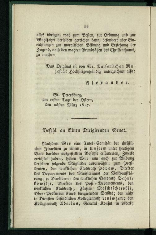 Von der Gesellschaft christlicher Israeliten und der für dieselbe errichteten Tutel-Comität. Befehl an Einen Dirigirenden Senat.
