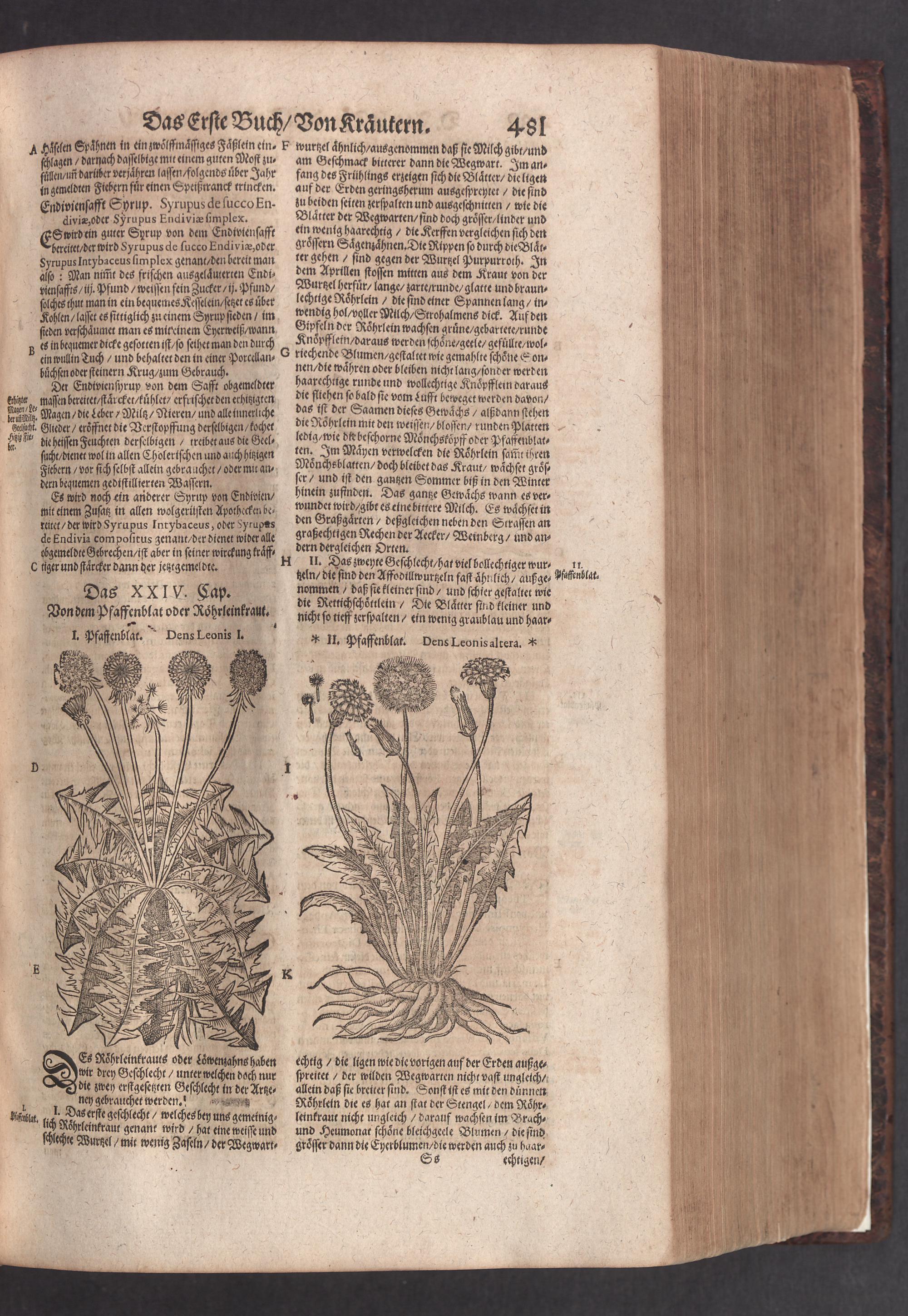 D. Jacobi Theodori Tabernaemontani, Neu vollkommen Kräuter-Buch : Darinnen Uber 3000. Kräuter/ mit schönen und kunstlichen Figuren/ auch deren Underscheid und Würckung/ samt ihren Namen in mancherley Sprachen/ beschrieben: Desgleichen auch/ wie dieselbige in allerhand Kranckheiten/ beyde der Menschen und des Viehs/ sollen angewendet und gebraucht werden/ angezeigt wird. Erstlichen durch Casparum Bauhinum D. und Profess. Basil. mit vielen neuen Figuren/ nutzlichen Artzneyen/ und anderem/ mit sonderem Fleis gebesseret/ Zum Andern Durch Hieronymum Bauhinum D. und Profess. Basil. mit sehr nutzlichen Marginalien, Synonimis, neuen Registeren und anderem vermehrt