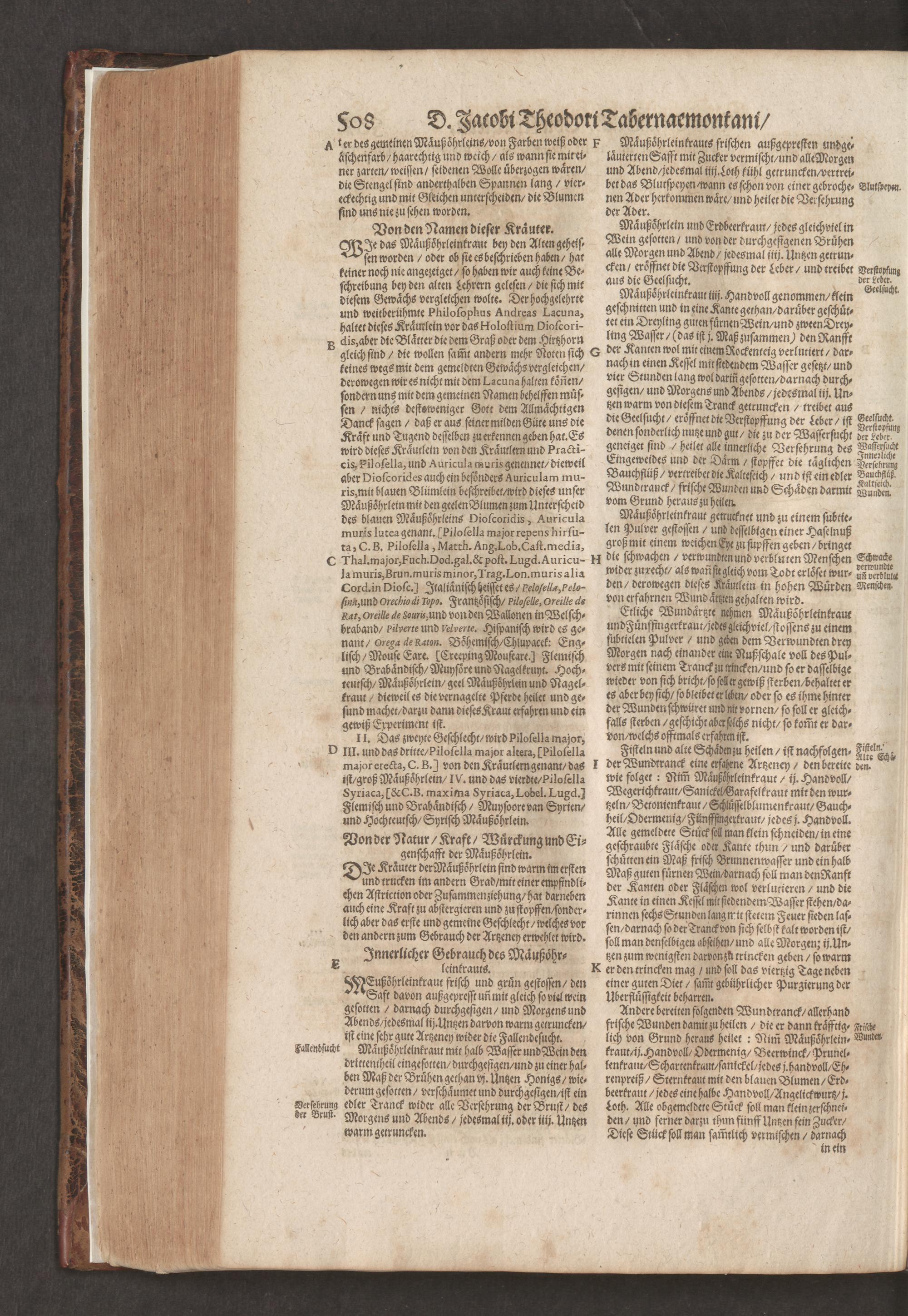 D. Jacobi Theodori Tabernaemontani, Neu vollkommen Kräuter-Buch : Darinnen Uber 3000. Kräuter/ mit schönen und kunstlichen Figuren/ auch deren Underscheid und Würckung/ samt ihren Namen in mancherley Sprachen/ beschrieben: Desgleichen auch/ wie dieselbige in allerhand Kranckheiten/ beyde der Menschen und des Viehs/ sollen angewendet und gebraucht werden/ angezeigt wird. Erstlichen durch Casparum Bauhinum D. und Profess. Basil. mit vielen neuen Figuren/ nutzlichen Artzneyen/ und anderem/ mit sonderem Fleis gebesseret/ Zum Andern Durch Hieronymum Bauhinum D. und Profess. Basil. mit sehr nutzlichen Marginalien, Synonimis, neuen Registeren und anderem vermehrt