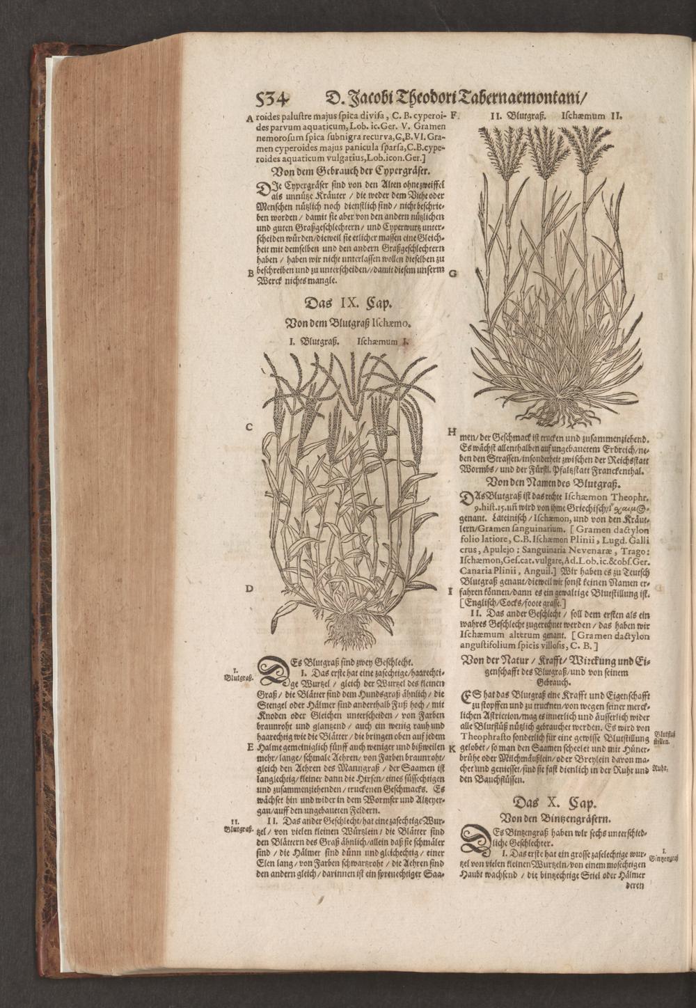 D. Jacobi Theodori Tabernaemontani, Neu vollkommen Kräuter-Buch : Darinnen Uber 3000. Kräuter/ mit schönen und kunstlichen Figuren/ auch deren Underscheid und Würckung/ samt ihren Namen in mancherley Sprachen/ beschrieben: Desgleichen auch/ wie dieselbige in allerhand Kranckheiten/ beyde der Menschen und des Viehs/ sollen angewendet und gebraucht werden/ angezeigt wird. Erstlichen durch Casparum Bauhinum D. und Profess. Basil. mit vielen neuen Figuren/ nutzlichen Artzneyen/ und anderem/ mit sonderem Fleis gebesseret/ Zum Andern Durch Hieronymum Bauhinum D. und Profess. Basil. mit sehr nutzlichen Marginalien, Synonimis, neuen Registeren und anderem vermehrt