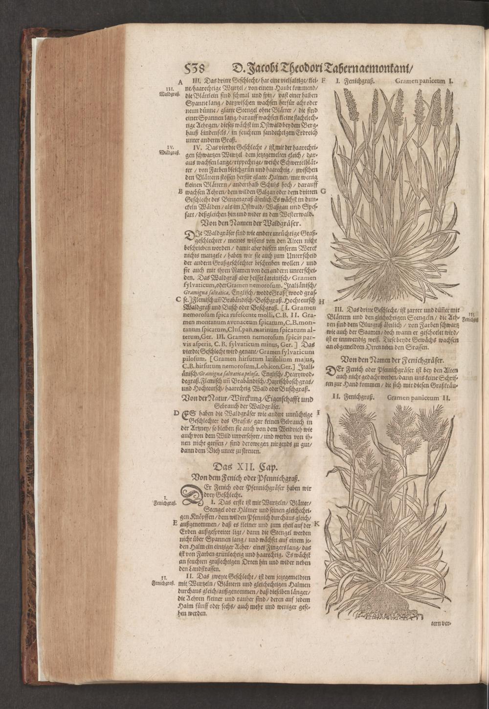 D. Jacobi Theodori Tabernaemontani, Neu vollkommen Kräuter-Buch : Darinnen Uber 3000. Kräuter/ mit schönen und kunstlichen Figuren/ auch deren Underscheid und Würckung/ samt ihren Namen in mancherley Sprachen/ beschrieben: Desgleichen auch/ wie dieselbige in allerhand Kranckheiten/ beyde der Menschen und des Viehs/ sollen angewendet und gebraucht werden/ angezeigt wird. Erstlichen durch Casparum Bauhinum D. und Profess. Basil. mit vielen neuen Figuren/ nutzlichen Artzneyen/ und anderem/ mit sonderem Fleis gebesseret/ Zum Andern Durch Hieronymum Bauhinum D. und Profess. Basil. mit sehr nutzlichen Marginalien, Synonimis, neuen Registeren und anderem vermehrt