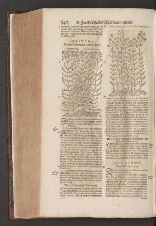 D. Jacobi Theodori Tabernaemontani, Neu vollkommen Kräuter-Buch : Darinnen Uber 3000. Kräuter/ mit schönen und kunstlichen Figuren/ auch deren Underscheid und Würckung/ samt ihren Namen in mancherley Sprachen/ beschrieben: Desgleichen auch/ wie dieselbige in allerhand Kranckheiten/ beyde der Menschen und des Viehs/ sollen angewendet und gebraucht werden/ angezeigt wird. Erstlichen durch Casparum Bauhinum D. und Profess. Basil. mit vielen neuen Figuren/ nutzlichen Artzneyen/ und anderem/ mit sonderem Fleis gebesseret/ Zum Andern Durch Hieronymum Bauhinum D. und Profess. Basil. mit sehr nutzlichen Marginalien, Synonimis, neuen Registeren und anderem vermehrt