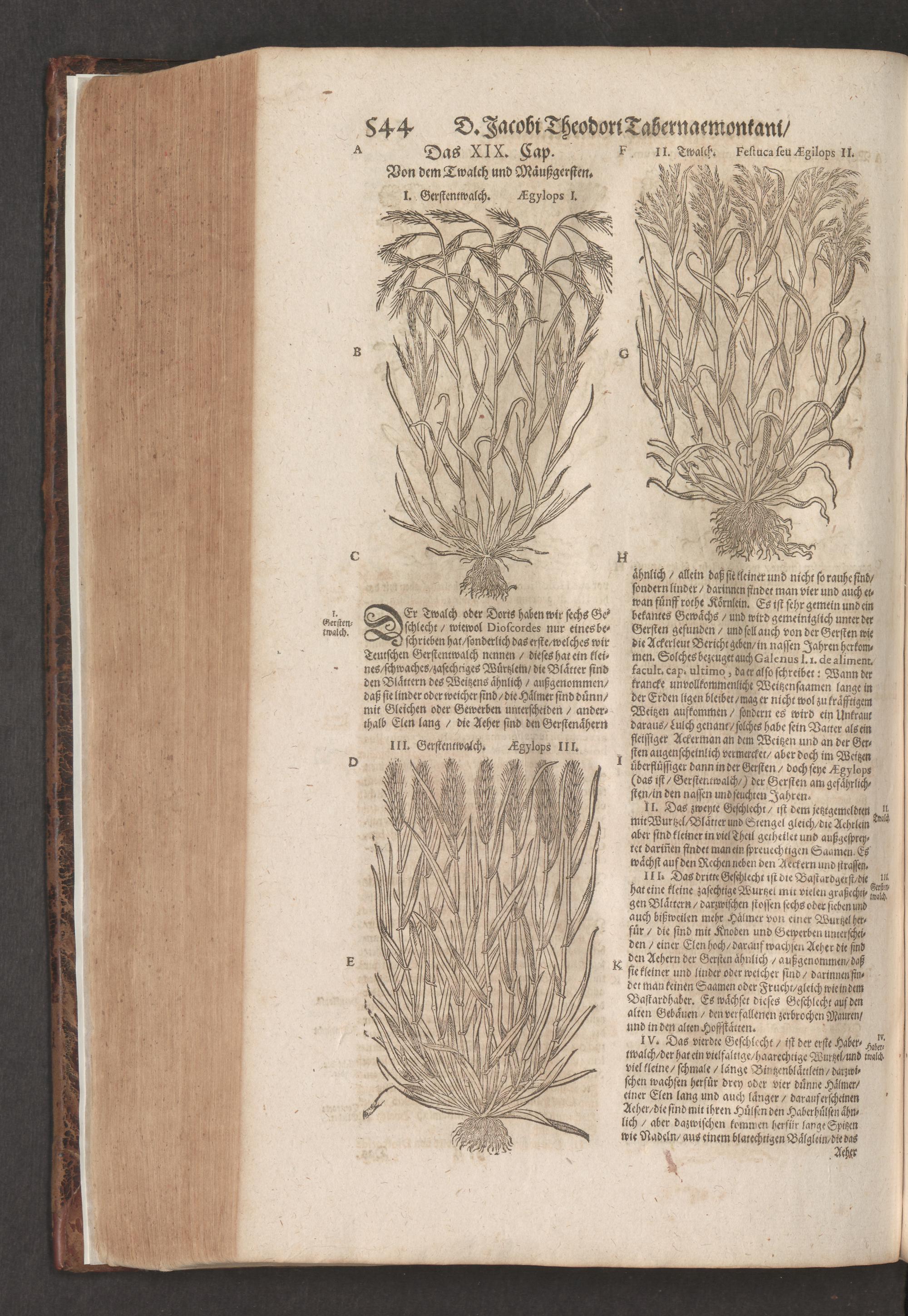 D. Jacobi Theodori Tabernaemontani, Neu vollkommen Kräuter-Buch : Darinnen Uber 3000. Kräuter/ mit schönen und kunstlichen Figuren/ auch deren Underscheid und Würckung/ samt ihren Namen in mancherley Sprachen/ beschrieben: Desgleichen auch/ wie dieselbige in allerhand Kranckheiten/ beyde der Menschen und des Viehs/ sollen angewendet und gebraucht werden/ angezeigt wird. Erstlichen durch Casparum Bauhinum D. und Profess. Basil. mit vielen neuen Figuren/ nutzlichen Artzneyen/ und anderem/ mit sonderem Fleis gebesseret/ Zum Andern Durch Hieronymum Bauhinum D. und Profess. Basil. mit sehr nutzlichen Marginalien, Synonimis, neuen Registeren und anderem vermehrt