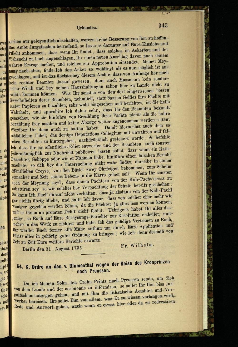 64. K. Ordre an den v. Blumenthal wegen der Reise des Kronprinzen nach Preussen.