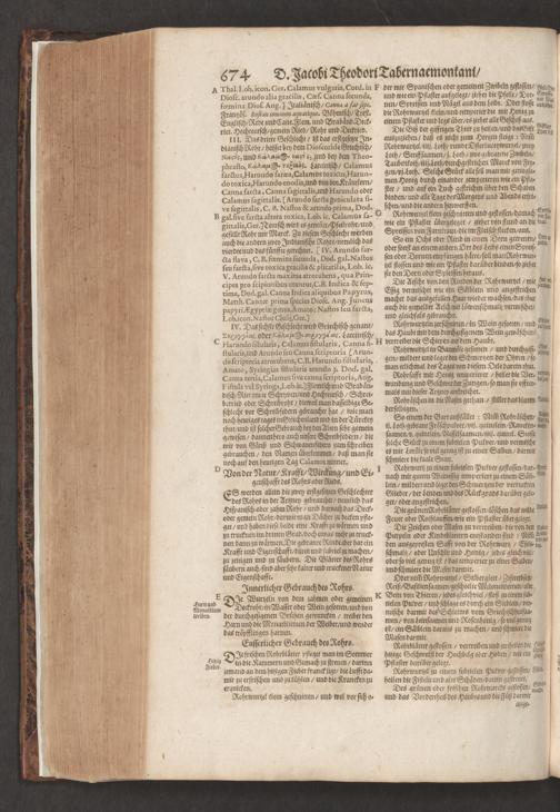 D. Jacobi Theodori Tabernaemontani, Neu vollkommen Kräuter-Buch : Darinnen Uber 3000. Kräuter/ mit schönen und kunstlichen Figuren/ auch deren Underscheid und Würckung/ samt ihren Namen in mancherley Sprachen/ beschrieben: Desgleichen auch/ wie dieselbige in allerhand Kranckheiten/ beyde der Menschen und des Viehs/ sollen angewendet und gebraucht werden/ angezeigt wird. Erstlichen durch Casparum Bauhinum D. und Profess. Basil. mit vielen neuen Figuren/ nutzlichen Artzneyen/ und anderem/ mit sonderem Fleis gebesseret/ Zum Andern Durch Hieronymum Bauhinum D. und Profess. Basil. mit sehr nutzlichen Marginalien, Synonimis, neuen Registeren und anderem vermehrt