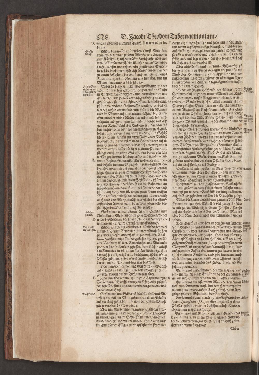 D. Jacobi Theodori Tabernaemontani, Neu vollkommen Kräuter-Buch : Darinnen Uber 3000. Kräuter/ mit schönen und kunstlichen Figuren/ auch deren Underscheid und Würckung/ samt ihren Namen in mancherley Sprachen/ beschrieben: Desgleichen auch/ wie dieselbige in allerhand Kranckheiten/ beyde der Menschen und des Viehs/ sollen angewendet und gebraucht werden/ angezeigt wird. Erstlichen durch Casparum Bauhinum D. und Profess. Basil. mit vielen neuen Figuren/ nutzlichen Artzneyen/ und anderem/ mit sonderem Fleis gebesseret/ Zum Andern Durch Hieronymum Bauhinum D. und Profess. Basil. mit sehr nutzlichen Marginalien, Synonimis, neuen Registeren und anderem vermehrt
