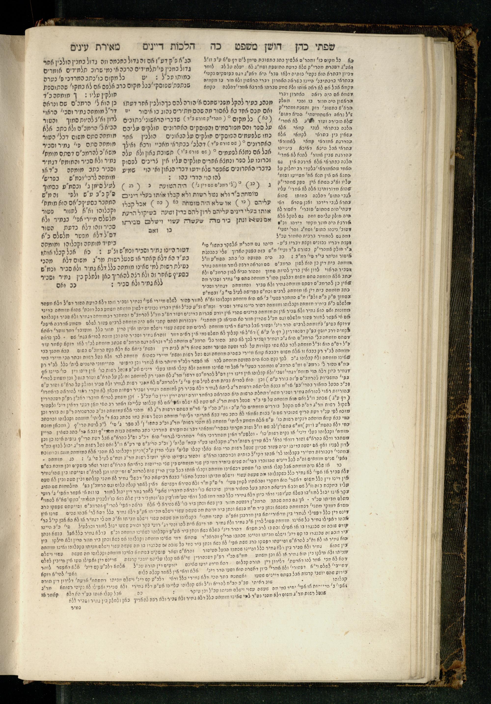 Sefer Torat kohanim : Shulḥan ʿarukh mi-ṭur Ḥoshen mishpaṭ : ʿim ha-beʾurim h.h. Meʾirat ʿenayim ṿe-Śifte kohen ; ... ṿe-hagahotaṿ ... Yosef Ḳaro z.l. ṿe-m.v.h.r.r. Mosheh Iserlez z.l. ...ספר תורת כהנים : שלחן ערוך מטור חשן משפט ; עם הביאורים ה״ה מאירת עינים ושפתי הכן ... והגהותיו מוהר״ר יוסף קארו ז״ל ומוהר״ר משה איסרלז ז״ל ...