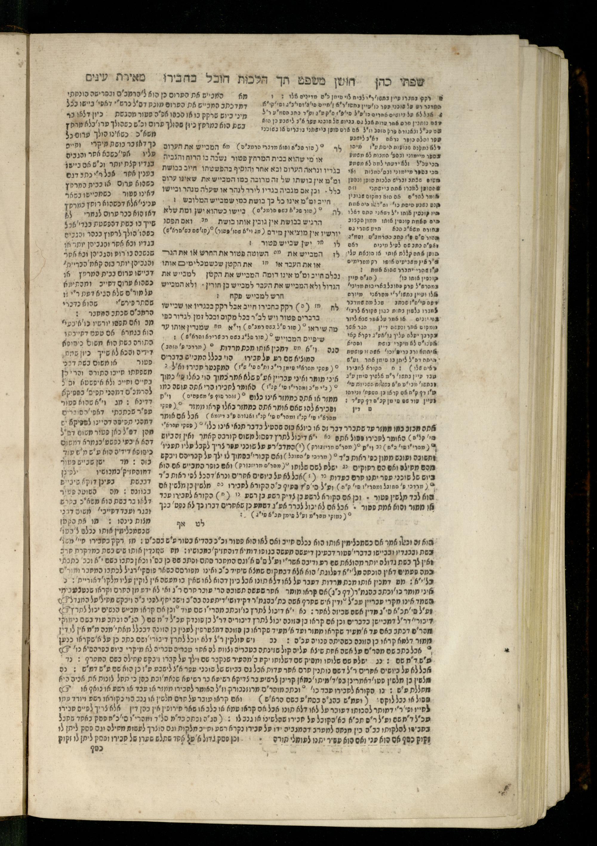 Sefer Torat kohanim : Shulḥan ʿarukh mi-ṭur Ḥoshen mishpaṭ : ʿim ha-beʾurim h.h. Meʾirat ʿenayim ṿe-Śifte kohen ; ... ṿe-hagahotaṿ ... Yosef Ḳaro z.l. ṿe-m.v.h.r.r. Mosheh Iserlez z.l. ...ספר תורת כהנים : שלחן ערוך מטור חשן משפט ; עם הביאורים ה״ה מאירת עינים ושפתי הכן ... והגהותיו מוהר״ר יוסף קארו ז״ל ומוהר״ר משה איסרלז ז״ל ...