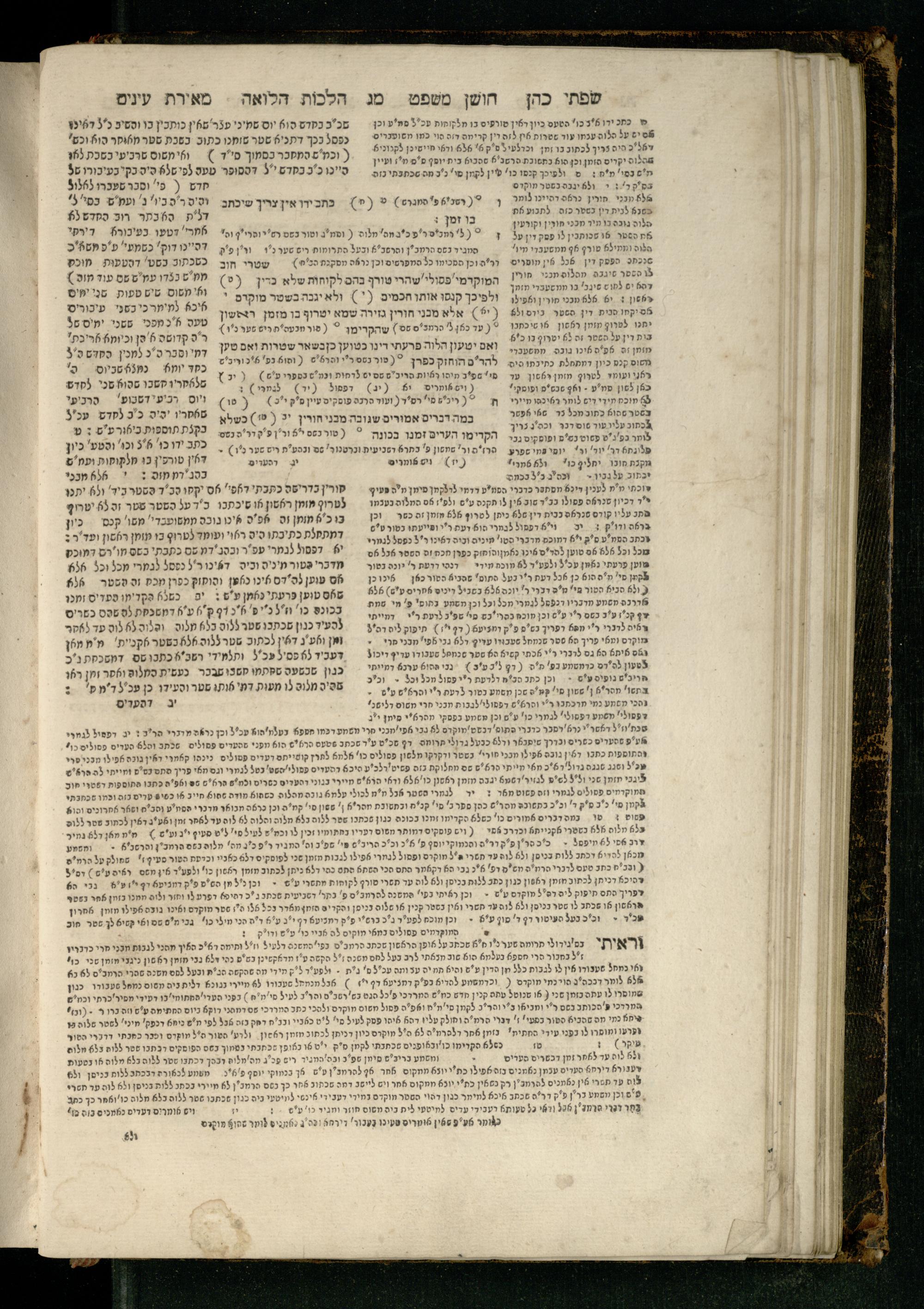 Sefer Torat kohanim : Shulḥan ʿarukh mi-ṭur Ḥoshen mishpaṭ : ʿim ha-beʾurim h.h. Meʾirat ʿenayim ṿe-Śifte kohen ; ... ṿe-hagahotaṿ ... Yosef Ḳaro z.l. ṿe-m.v.h.r.r. Mosheh Iserlez z.l. ...ספר תורת כהנים : שלחן ערוך מטור חשן משפט ; עם הביאורים ה״ה מאירת עינים ושפתי הכן ... והגהותיו מוהר״ר יוסף קארו ז״ל ומוהר״ר משה איסרלז ז״ל ...
