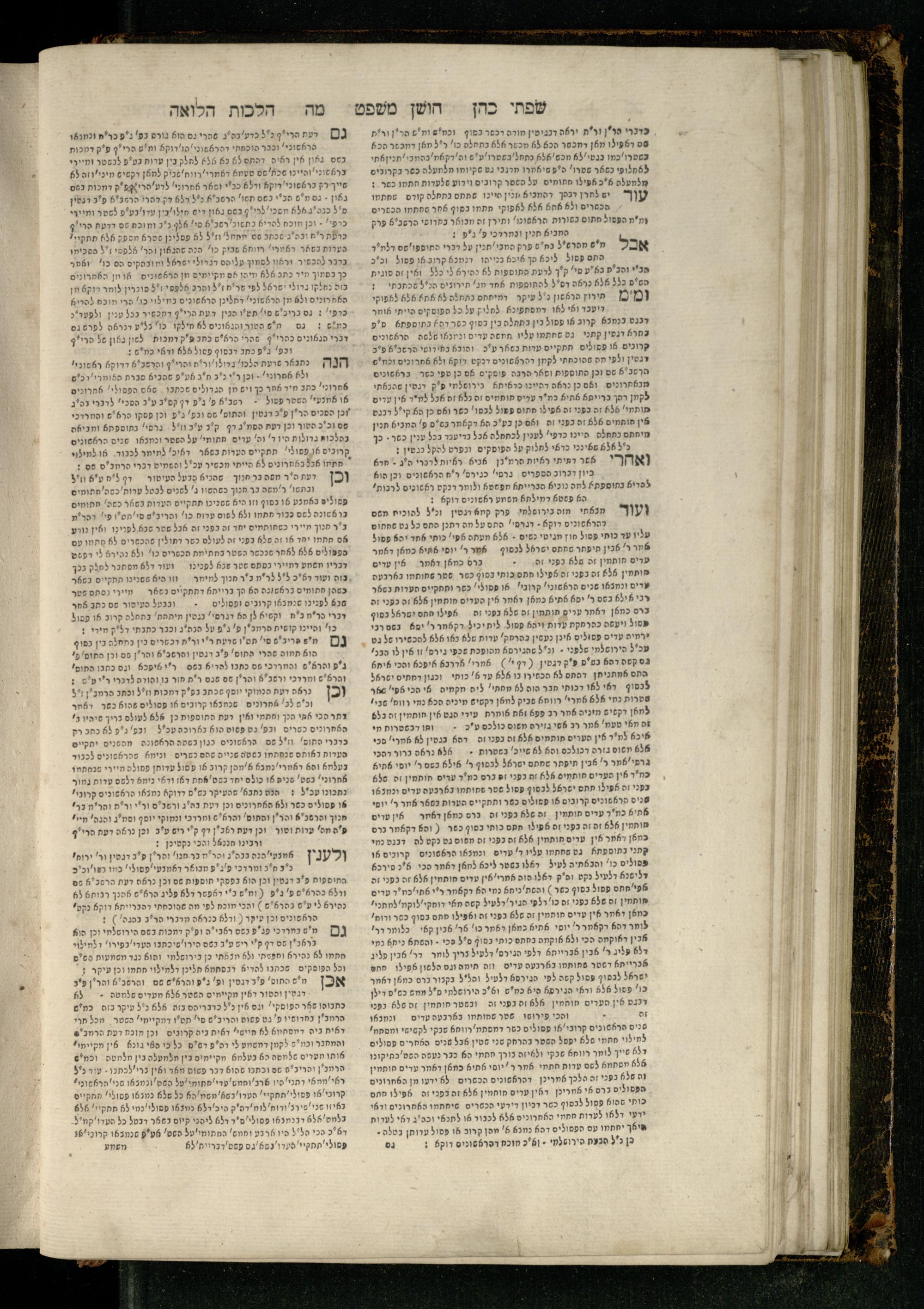 Sefer Torat kohanim : Shulḥan ʿarukh mi-ṭur Ḥoshen mishpaṭ : ʿim ha-beʾurim h.h. Meʾirat ʿenayim ṿe-Śifte kohen ; ... ṿe-hagahotaṿ ... Yosef Ḳaro z.l. ṿe-m.v.h.r.r. Mosheh Iserlez z.l. ...ספר תורת כהנים : שלחן ערוך מטור חשן משפט ; עם הביאורים ה״ה מאירת עינים ושפתי הכן ... והגהותיו מוהר״ר יוסף קארו ז״ל ומוהר״ר משה איסרלז ז״ל ...