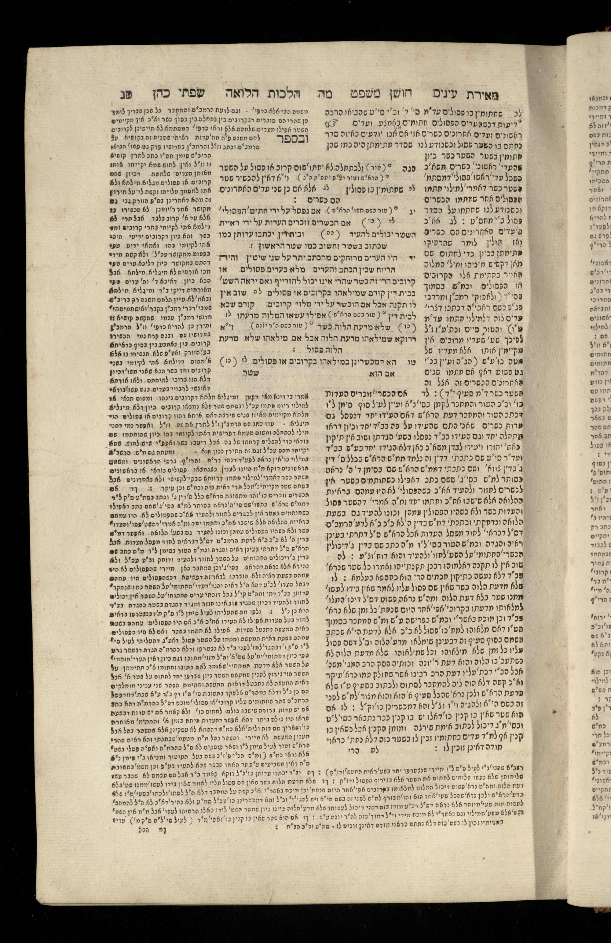 Sefer Torat kohanim : Shulḥan ʿarukh mi-ṭur Ḥoshen mishpaṭ : ʿim ha-beʾurim h.h. Meʾirat ʿenayim ṿe-Śifte kohen ; ... ṿe-hagahotaṿ ... Yosef Ḳaro z.l. ṿe-m.v.h.r.r. Mosheh Iserlez z.l. ...ספר תורת כהנים : שלחן ערוך מטור חשן משפט ; עם הביאורים ה״ה מאירת עינים ושפתי הכן ... והגהותיו מוהר״ר יוסף קארו ז״ל ומוהר״ר משה איסרלז ז״ל ...