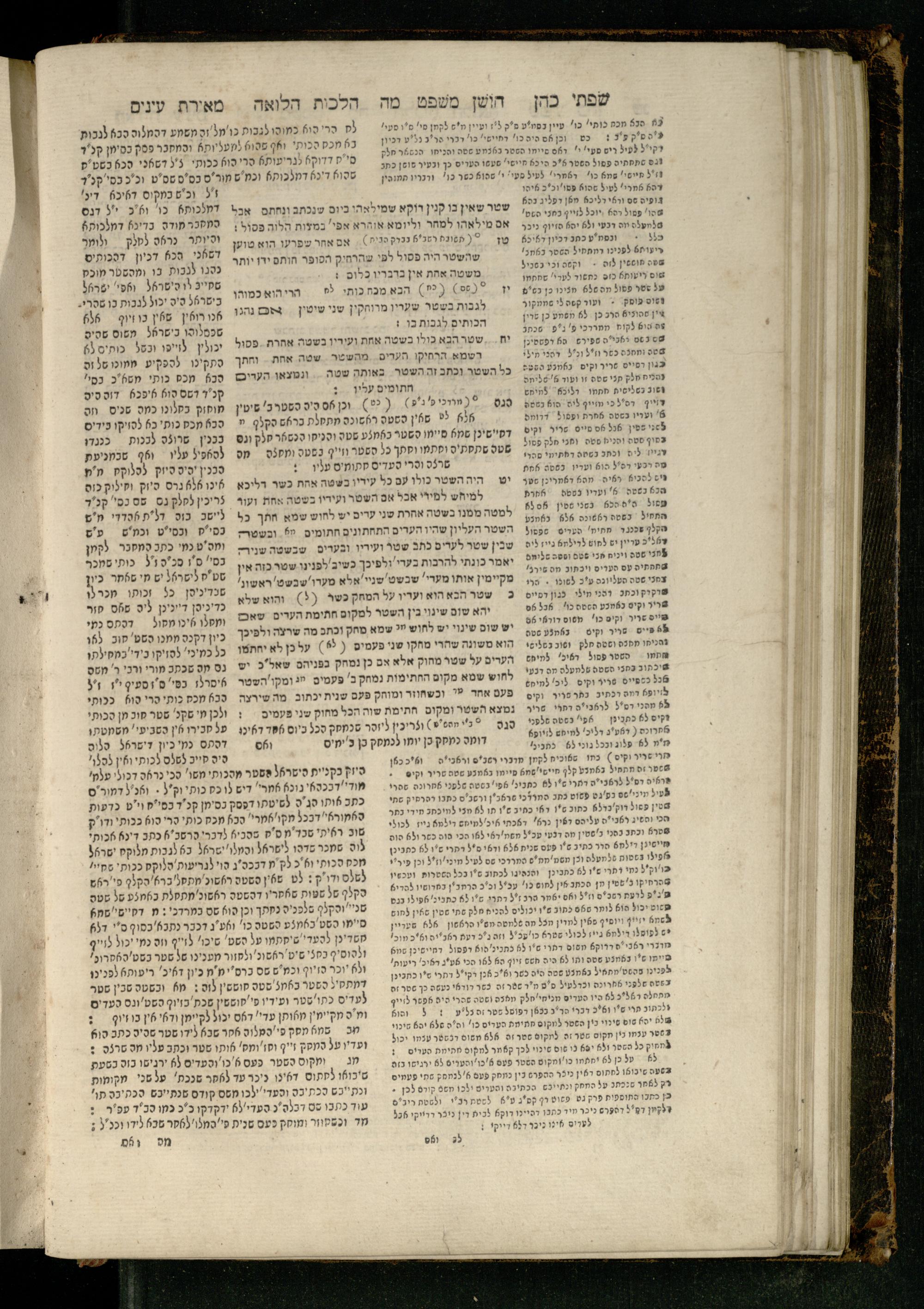 Sefer Torat kohanim : Shulḥan ʿarukh mi-ṭur Ḥoshen mishpaṭ : ʿim ha-beʾurim h.h. Meʾirat ʿenayim ṿe-Śifte kohen ; ... ṿe-hagahotaṿ ... Yosef Ḳaro z.l. ṿe-m.v.h.r.r. Mosheh Iserlez z.l. ...ספר תורת כהנים : שלחן ערוך מטור חשן משפט ; עם הביאורים ה״ה מאירת עינים ושפתי הכן ... והגהותיו מוהר״ר יוסף קארו ז״ל ומוהר״ר משה איסרלז ז״ל ...