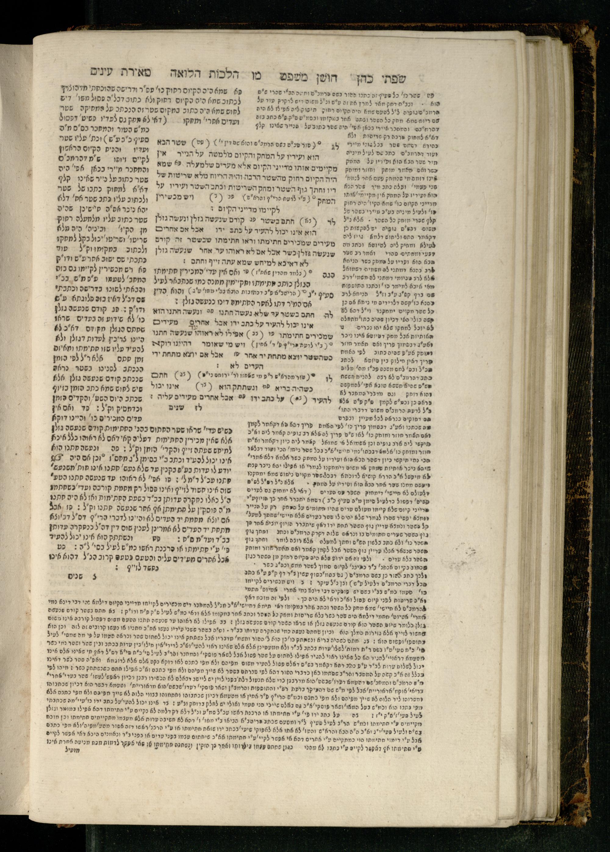 Sefer Torat kohanim : Shulḥan ʿarukh mi-ṭur Ḥoshen mishpaṭ : ʿim ha-beʾurim h.h. Meʾirat ʿenayim ṿe-Śifte kohen ; ... ṿe-hagahotaṿ ... Yosef Ḳaro z.l. ṿe-m.v.h.r.r. Mosheh Iserlez z.l. ...ספר תורת כהנים : שלחן ערוך מטור חשן משפט ; עם הביאורים ה״ה מאירת עינים ושפתי הכן ... והגהותיו מוהר״ר יוסף קארו ז״ל ומוהר״ר משה איסרלז ז״ל ...