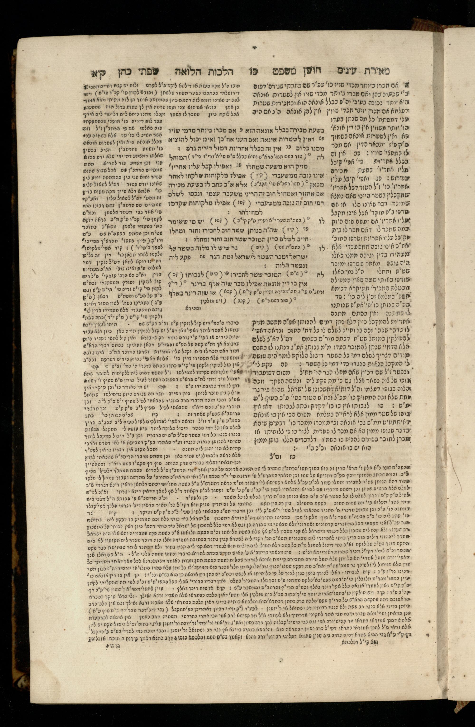 Sefer Torat kohanim : Shulḥan ʿarukh mi-ṭur Ḥoshen mishpaṭ : ʿim ha-beʾurim h.h. Meʾirat ʿenayim ṿe-Śifte kohen ; ... ṿe-hagahotaṿ ... Yosef Ḳaro z.l. ṿe-m.v.h.r.r. Mosheh Iserlez z.l. ...ספר תורת כהנים : שלחן ערוך מטור חשן משפט ; עם הביאורים ה״ה מאירת עינים ושפתי הכן ... והגהותיו מוהר״ר יוסף קארו ז״ל ומוהר״ר משה איסרלז ז״ל ...