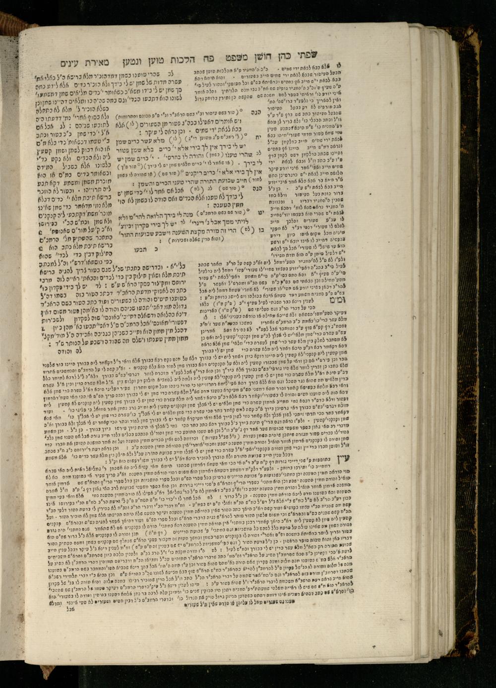 Sefer Torat kohanim : Shulḥan ʿarukh mi-ṭur Ḥoshen mishpaṭ : ʿim ha-beʾurim h.h. Meʾirat ʿenayim ṿe-Śifte kohen ; ... ṿe-hagahotaṿ ... Yosef Ḳaro z.l. ṿe-m.v.h.r.r. Mosheh Iserlez z.l. ...ספר תורת כהנים : שלחן ערוך מטור חשן משפט ; עם הביאורים ה״ה מאירת עינים ושפתי הכן ... והגהותיו מוהר״ר יוסף קארו ז״ל ומוהר״ר משה איסרלז ז״ל ...