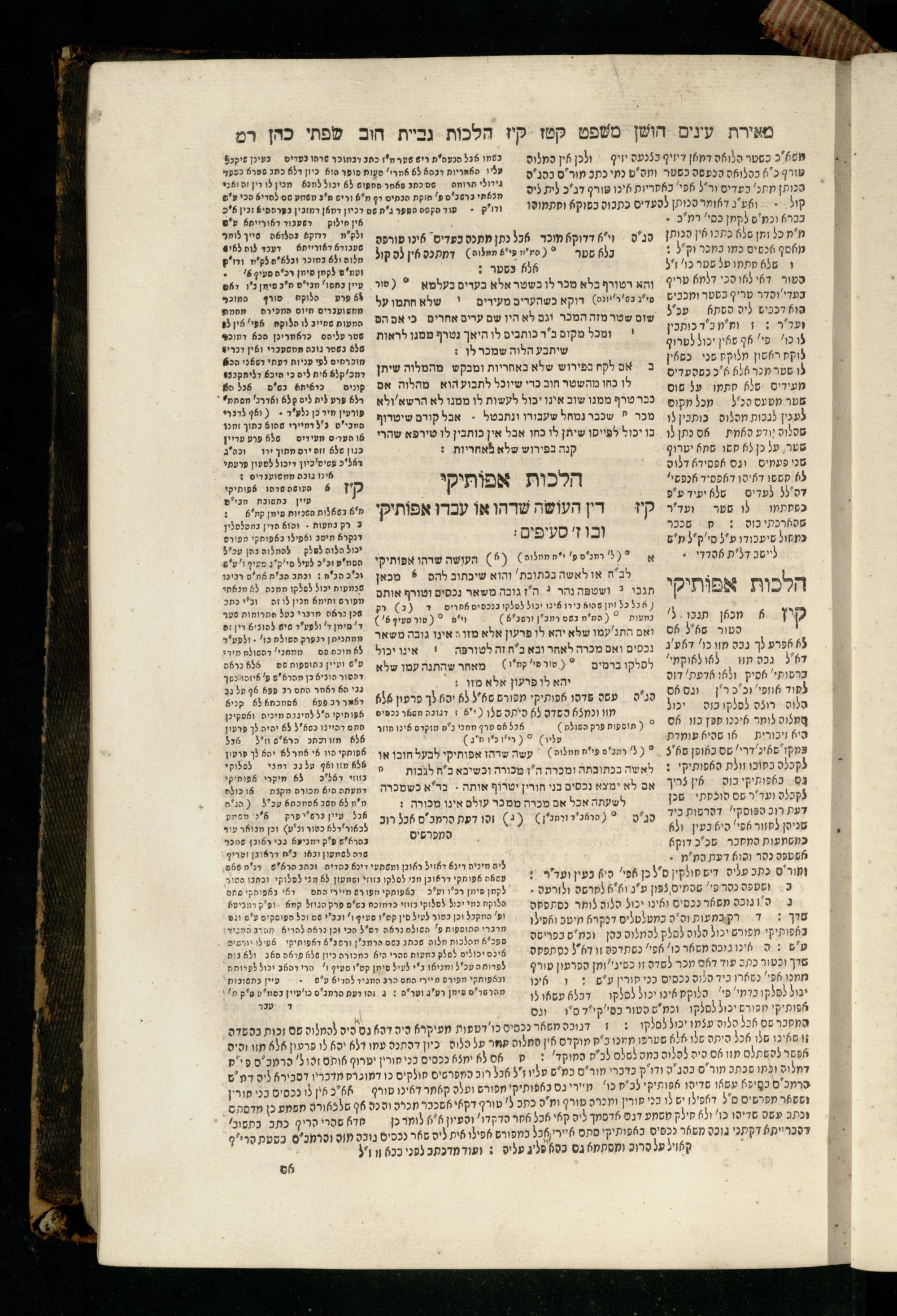 Sefer Torat kohanim : Shulḥan ʿarukh mi-ṭur Ḥoshen mishpaṭ : ʿim ha-beʾurim h.h. Meʾirat ʿenayim ṿe-Śifte kohen ; ... ṿe-hagahotaṿ ... Yosef Ḳaro z.l. ṿe-m.v.h.r.r. Mosheh Iserlez z.l. ...ספר תורת כהנים : שלחן ערוך מטור חשן משפט ; עם הביאורים ה״ה מאירת עינים ושפתי הכן ... והגהותיו מוהר״ר יוסף קארו ז״ל ומוהר״ר משה איסרלז ז״ל ...