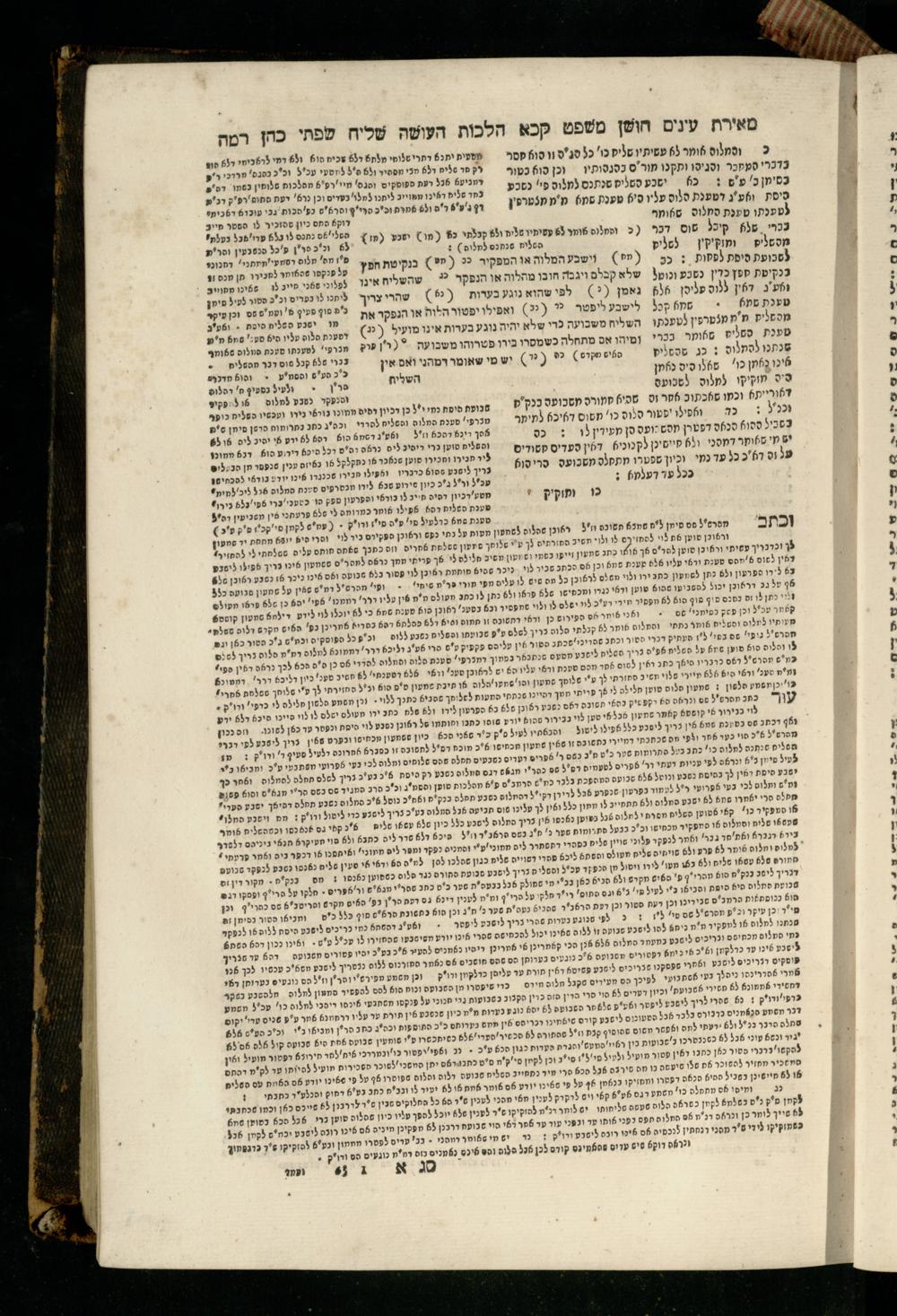 Sefer Torat kohanim : Shulḥan ʿarukh mi-ṭur Ḥoshen mishpaṭ : ʿim ha-beʾurim h.h. Meʾirat ʿenayim ṿe-Śifte kohen ; ... ṿe-hagahotaṿ ... Yosef Ḳaro z.l. ṿe-m.v.h.r.r. Mosheh Iserlez z.l. ...ספר תורת כהנים : שלחן ערוך מטור חשן משפט ; עם הביאורים ה״ה מאירת עינים ושפתי הכן ... והגהותיו מוהר״ר יוסף קארו ז״ל ומוהר״ר משה איסרלז ז״ל ...