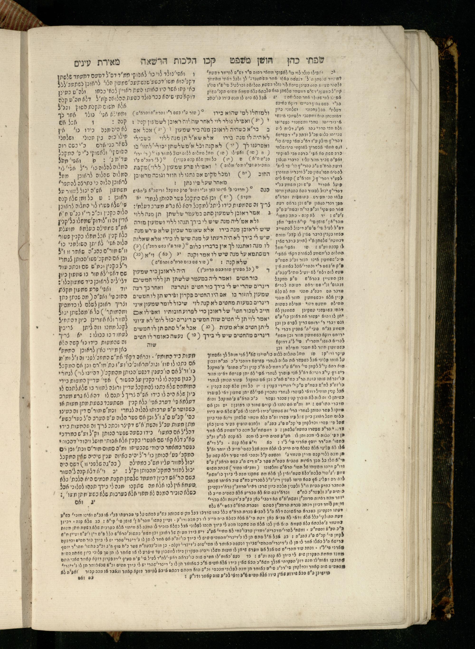 Sefer Torat kohanim : Shulḥan ʿarukh mi-ṭur Ḥoshen mishpaṭ : ʿim ha-beʾurim h.h. Meʾirat ʿenayim ṿe-Śifte kohen ; ... ṿe-hagahotaṿ ... Yosef Ḳaro z.l. ṿe-m.v.h.r.r. Mosheh Iserlez z.l. ...ספר תורת כהנים : שלחן ערוך מטור חשן משפט ; עם הביאורים ה״ה מאירת עינים ושפתי הכן ... והגהותיו מוהר״ר יוסף קארו ז״ל ומוהר״ר משה איסרלז ז״ל ...