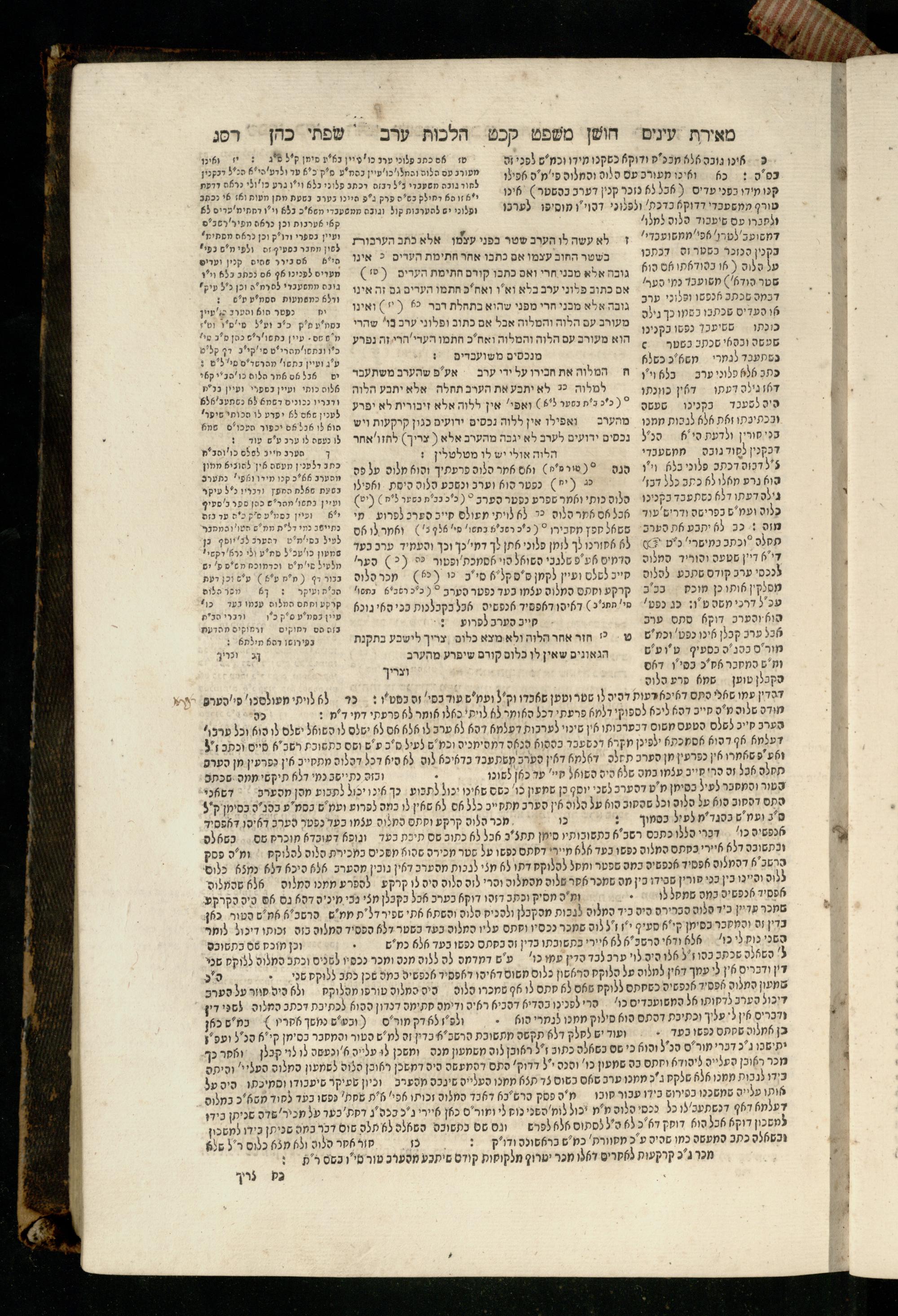 Sefer Torat kohanim : Shulḥan ʿarukh mi-ṭur Ḥoshen mishpaṭ : ʿim ha-beʾurim h.h. Meʾirat ʿenayim ṿe-Śifte kohen ; ... ṿe-hagahotaṿ ... Yosef Ḳaro z.l. ṿe-m.v.h.r.r. Mosheh Iserlez z.l. ...ספר תורת כהנים : שלחן ערוך מטור חשן משפט ; עם הביאורים ה״ה מאירת עינים ושפתי הכן ... והגהותיו מוהר״ר יוסף קארו ז״ל ומוהר״ר משה איסרלז ז״ל ...