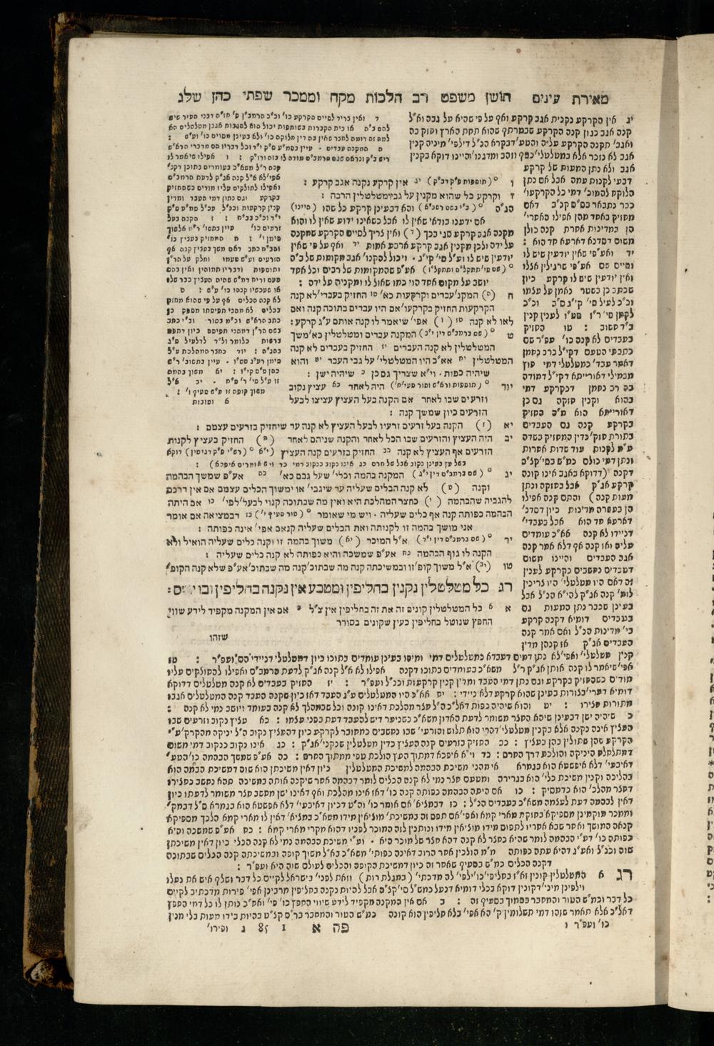 Sefer Torat kohanim : Shulḥan ʿarukh mi-ṭur Ḥoshen mishpaṭ : ʿim ha-beʾurim h.h. Meʾirat ʿenayim ṿe-Śifte kohen ; ... ṿe-hagahotaṿ ... Yosef Ḳaro z.l. ṿe-m.v.h.r.r. Mosheh Iserlez z.l. ...ספר תורת כהנים : שלחן ערוך מטור חשן משפט ; עם הביאורים ה״ה מאירת עינים ושפתי הכן ... והגהותיו מוהר״ר יוסף קארו ז״ל ומוהר״ר משה איסרלז ז״ל ...