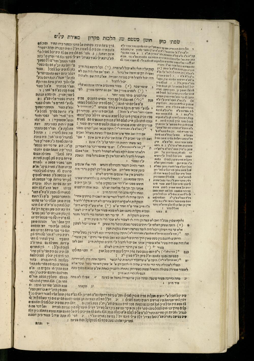 Sefer Torat kohanim : Shulḥan ʿarukh mi-ṭur Ḥoshen mishpaṭ : ʿim ha-beʾurim h.h. Meʾirat ʿenayim ṿe-Śifte kohen ; ... ṿe-hagahotaṿ ... Yosef Ḳaro z.l. ṿe-m.v.h.r.r. Mosheh Iserlez z.l. ...ספר תורת כהנים : שלחן ערוך מטור חשן משפט ; עם הביאורים ה״ה מאירת עינים ושפתי הכן ... והגהותיו מוהר״ר יוסף קארו ז״ל ומוהר״ר משה איסרלז ז״ל ...