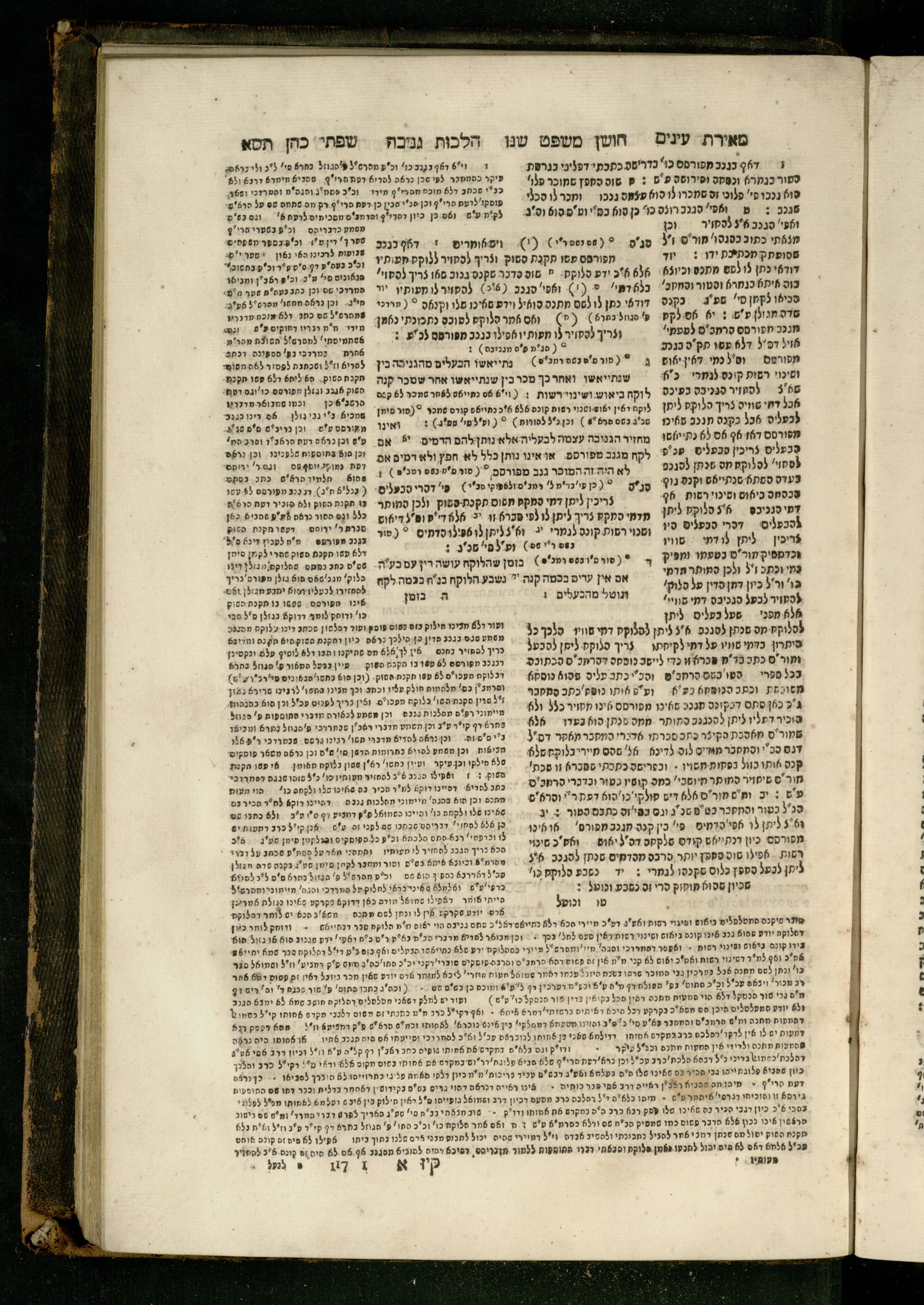 Sefer Torat kohanim : Shulḥan ʿarukh mi-ṭur Ḥoshen mishpaṭ : ʿim ha-beʾurim h.h. Meʾirat ʿenayim ṿe-Śifte kohen ; ... ṿe-hagahotaṿ ... Yosef Ḳaro z.l. ṿe-m.v.h.r.r. Mosheh Iserlez z.l. ...ספר תורת כהנים : שלחן ערוך מטור חשן משפט ; עם הביאורים ה״ה מאירת עינים ושפתי הכן ... והגהותיו מוהר״ר יוסף קארו ז״ל ומוהר״ר משה איסרלז ז״ל ...