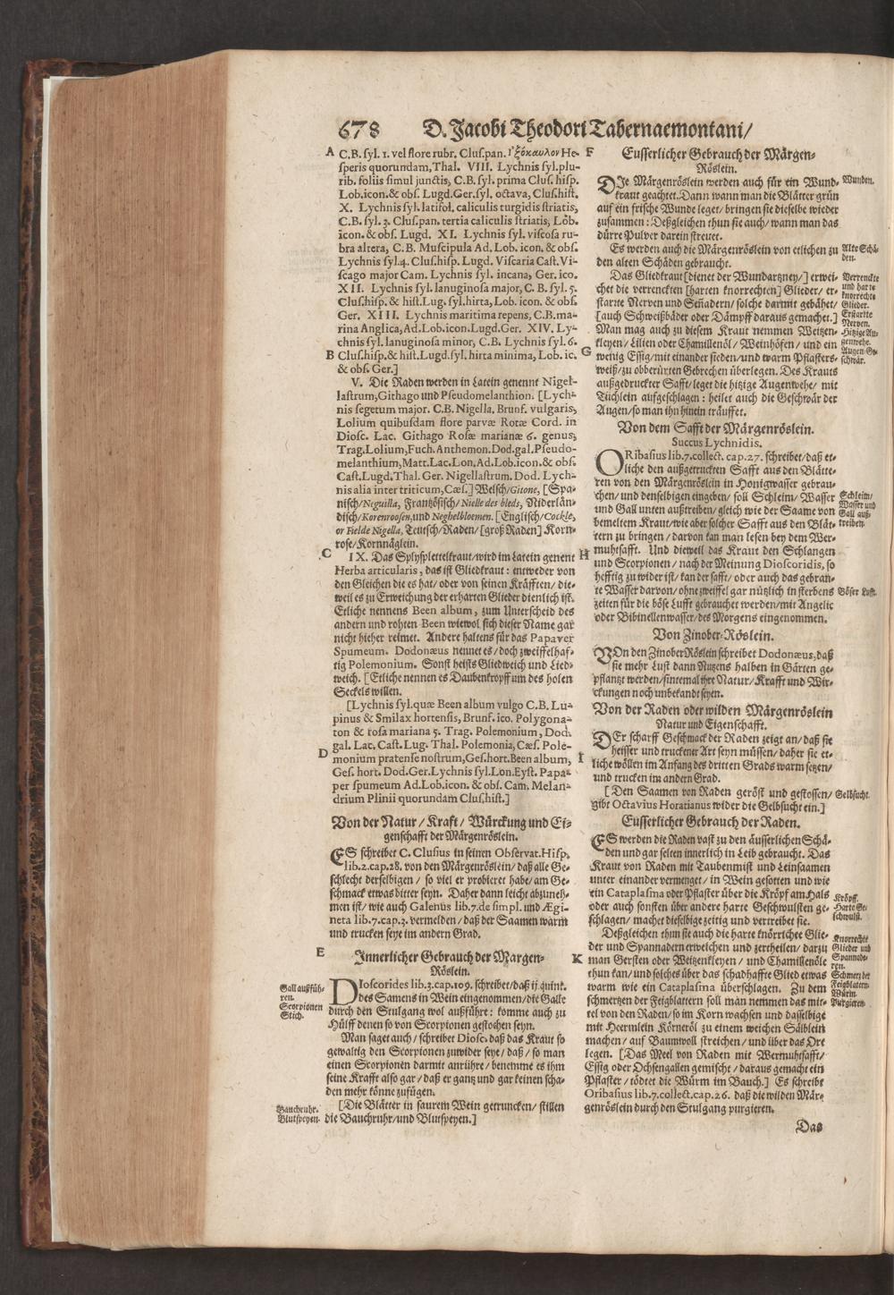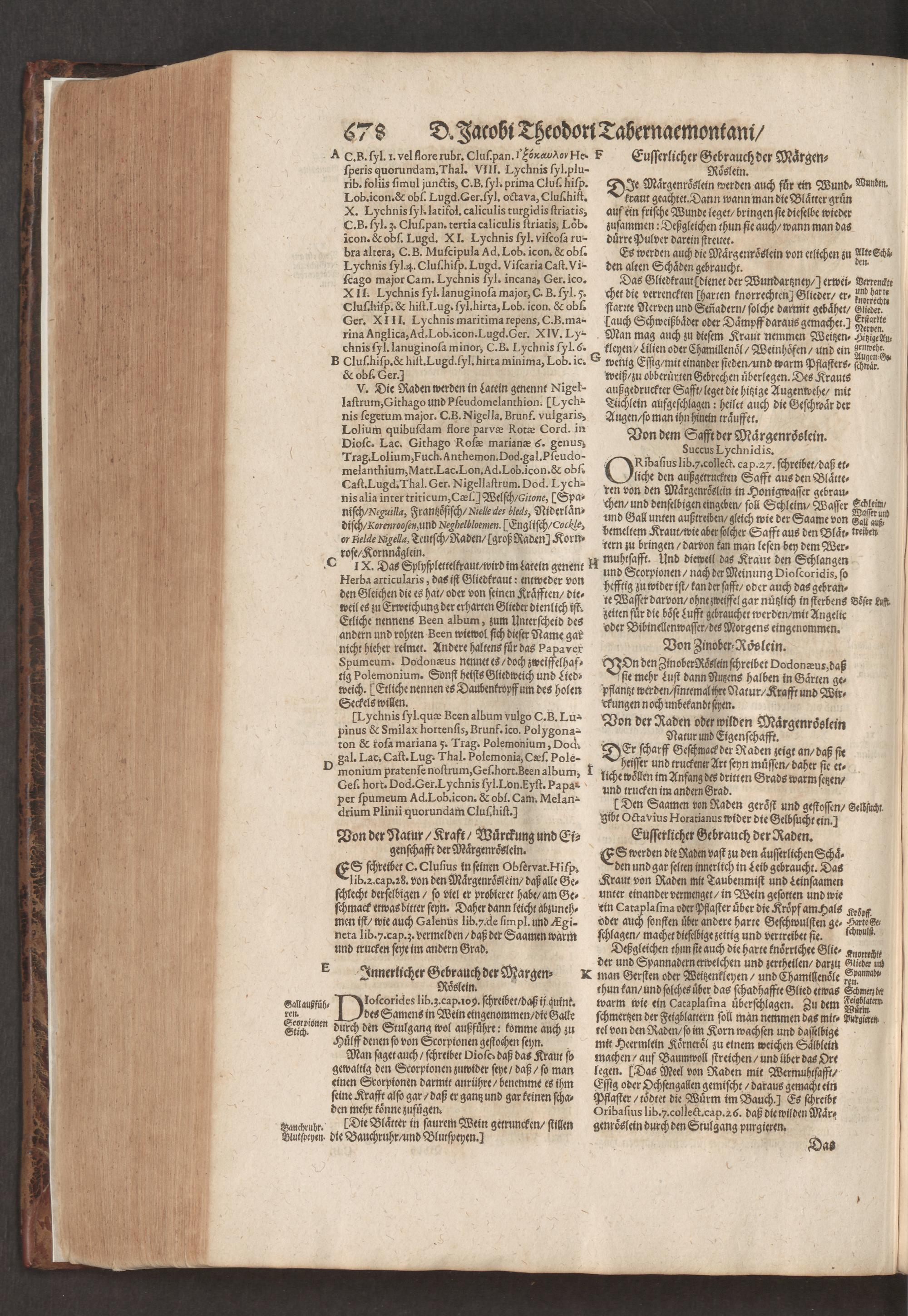 D. Jacobi Theodori Tabernaemontani, Neu vollkommen Kräuter-Buch : Darinnen Uber 3000. Kräuter/ mit schönen und kunstlichen Figuren/ auch deren Underscheid und Würckung/ samt ihren Namen in mancherley Sprachen/ beschrieben: Desgleichen auch/ wie dieselbige in allerhand Kranckheiten/ beyde der Menschen und des Viehs/ sollen angewendet und gebraucht werden/ angezeigt wird. Erstlichen durch Casparum Bauhinum D. und Profess. Basil. mit vielen neuen Figuren/ nutzlichen Artzneyen/ und anderem/ mit sonderem Fleis gebesseret/ Zum Andern Durch Hieronymum Bauhinum D. und Profess. Basil. mit sehr nutzlichen Marginalien, Synonimis, neuen Registeren und anderem vermehrt