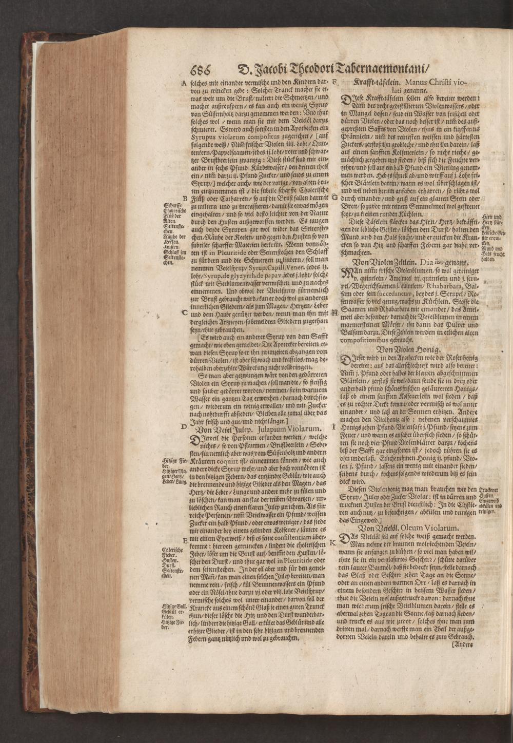D. Jacobi Theodori Tabernaemontani, Neu vollkommen Kräuter-Buch : Darinnen Uber 3000. Kräuter/ mit schönen und kunstlichen Figuren/ auch deren Underscheid und Würckung/ samt ihren Namen in mancherley Sprachen/ beschrieben: Desgleichen auch/ wie dieselbige in allerhand Kranckheiten/ beyde der Menschen und des Viehs/ sollen angewendet und gebraucht werden/ angezeigt wird. Erstlichen durch Casparum Bauhinum D. und Profess. Basil. mit vielen neuen Figuren/ nutzlichen Artzneyen/ und anderem/ mit sonderem Fleis gebesseret/ Zum Andern Durch Hieronymum Bauhinum D. und Profess. Basil. mit sehr nutzlichen Marginalien, Synonimis, neuen Registeren und anderem vermehrt