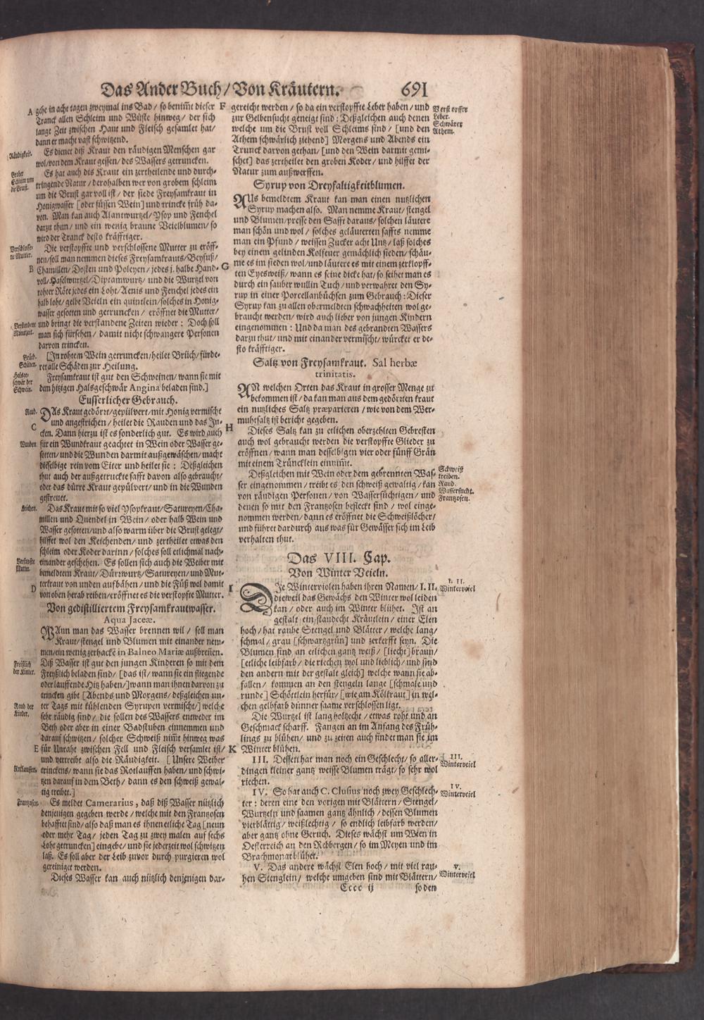 D. Jacobi Theodori Tabernaemontani, Neu vollkommen Kräuter-Buch : Darinnen Uber 3000. Kräuter/ mit schönen und kunstlichen Figuren/ auch deren Underscheid und Würckung/ samt ihren Namen in mancherley Sprachen/ beschrieben: Desgleichen auch/ wie dieselbige in allerhand Kranckheiten/ beyde der Menschen und des Viehs/ sollen angewendet und gebraucht werden/ angezeigt wird. Erstlichen durch Casparum Bauhinum D. und Profess. Basil. mit vielen neuen Figuren/ nutzlichen Artzneyen/ und anderem/ mit sonderem Fleis gebesseret/ Zum Andern Durch Hieronymum Bauhinum D. und Profess. Basil. mit sehr nutzlichen Marginalien, Synonimis, neuen Registeren und anderem vermehrt