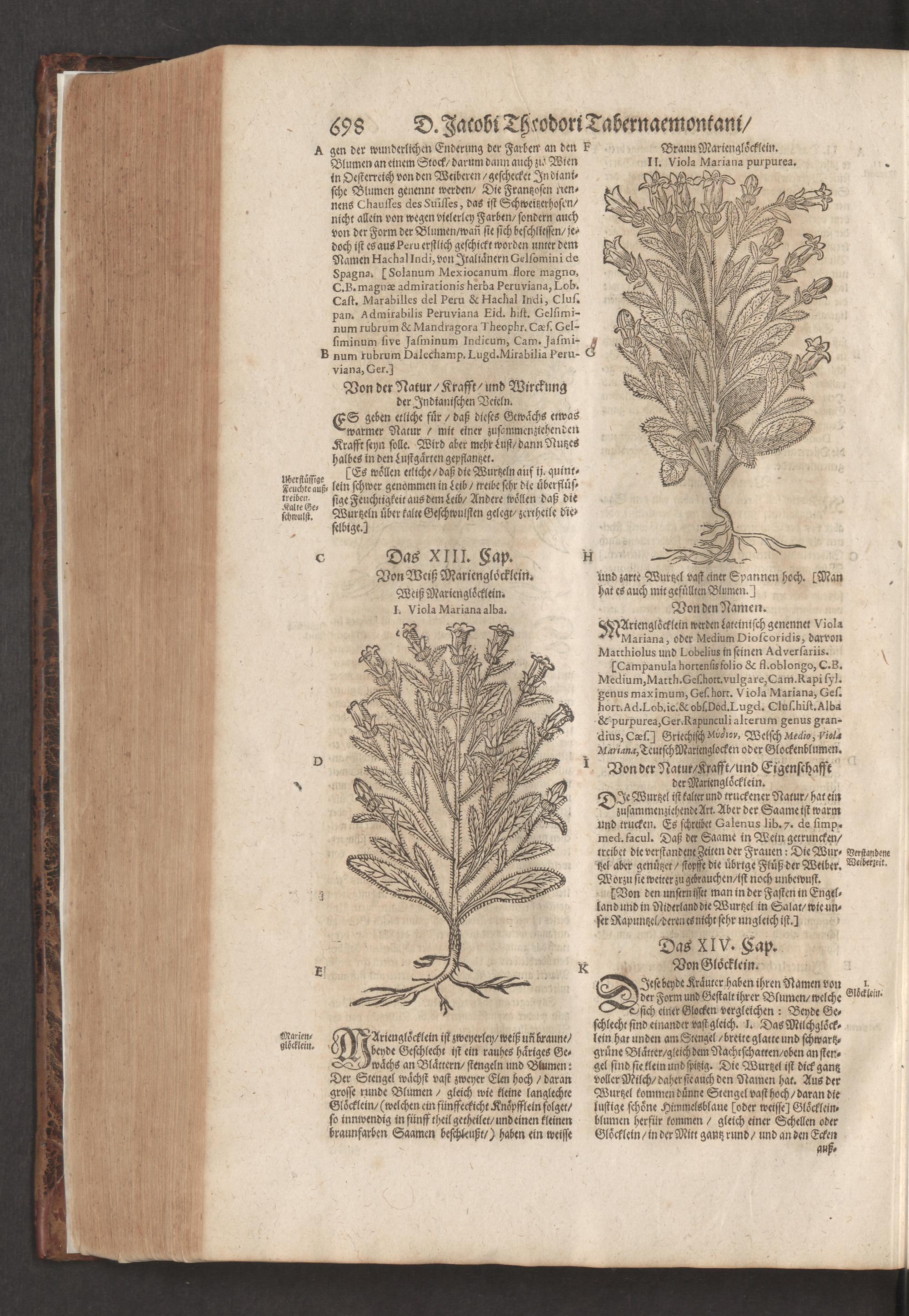 D. Jacobi Theodori Tabernaemontani, Neu vollkommen Kräuter-Buch : Darinnen Uber 3000. Kräuter/ mit schönen und kunstlichen Figuren/ auch deren Underscheid und Würckung/ samt ihren Namen in mancherley Sprachen/ beschrieben: Desgleichen auch/ wie dieselbige in allerhand Kranckheiten/ beyde der Menschen und des Viehs/ sollen angewendet und gebraucht werden/ angezeigt wird. Erstlichen durch Casparum Bauhinum D. und Profess. Basil. mit vielen neuen Figuren/ nutzlichen Artzneyen/ und anderem/ mit sonderem Fleis gebesseret/ Zum Andern Durch Hieronymum Bauhinum D. und Profess. Basil. mit sehr nutzlichen Marginalien, Synonimis, neuen Registeren und anderem vermehrt