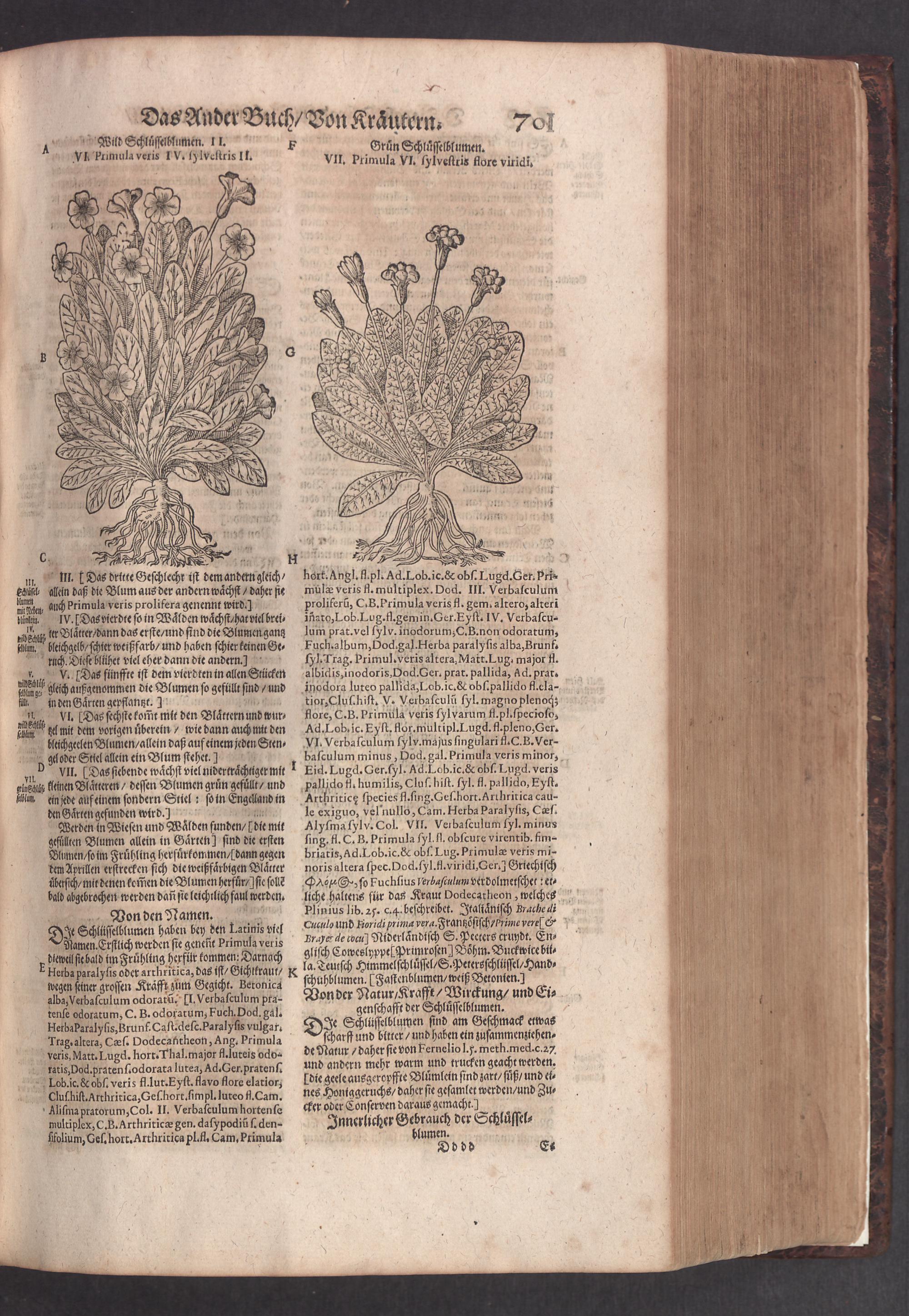 D. Jacobi Theodori Tabernaemontani, Neu vollkommen Kräuter-Buch : Darinnen Uber 3000. Kräuter/ mit schönen und kunstlichen Figuren/ auch deren Underscheid und Würckung/ samt ihren Namen in mancherley Sprachen/ beschrieben: Desgleichen auch/ wie dieselbige in allerhand Kranckheiten/ beyde der Menschen und des Viehs/ sollen angewendet und gebraucht werden/ angezeigt wird. Erstlichen durch Casparum Bauhinum D. und Profess. Basil. mit vielen neuen Figuren/ nutzlichen Artzneyen/ und anderem/ mit sonderem Fleis gebesseret/ Zum Andern Durch Hieronymum Bauhinum D. und Profess. Basil. mit sehr nutzlichen Marginalien, Synonimis, neuen Registeren und anderem vermehrt