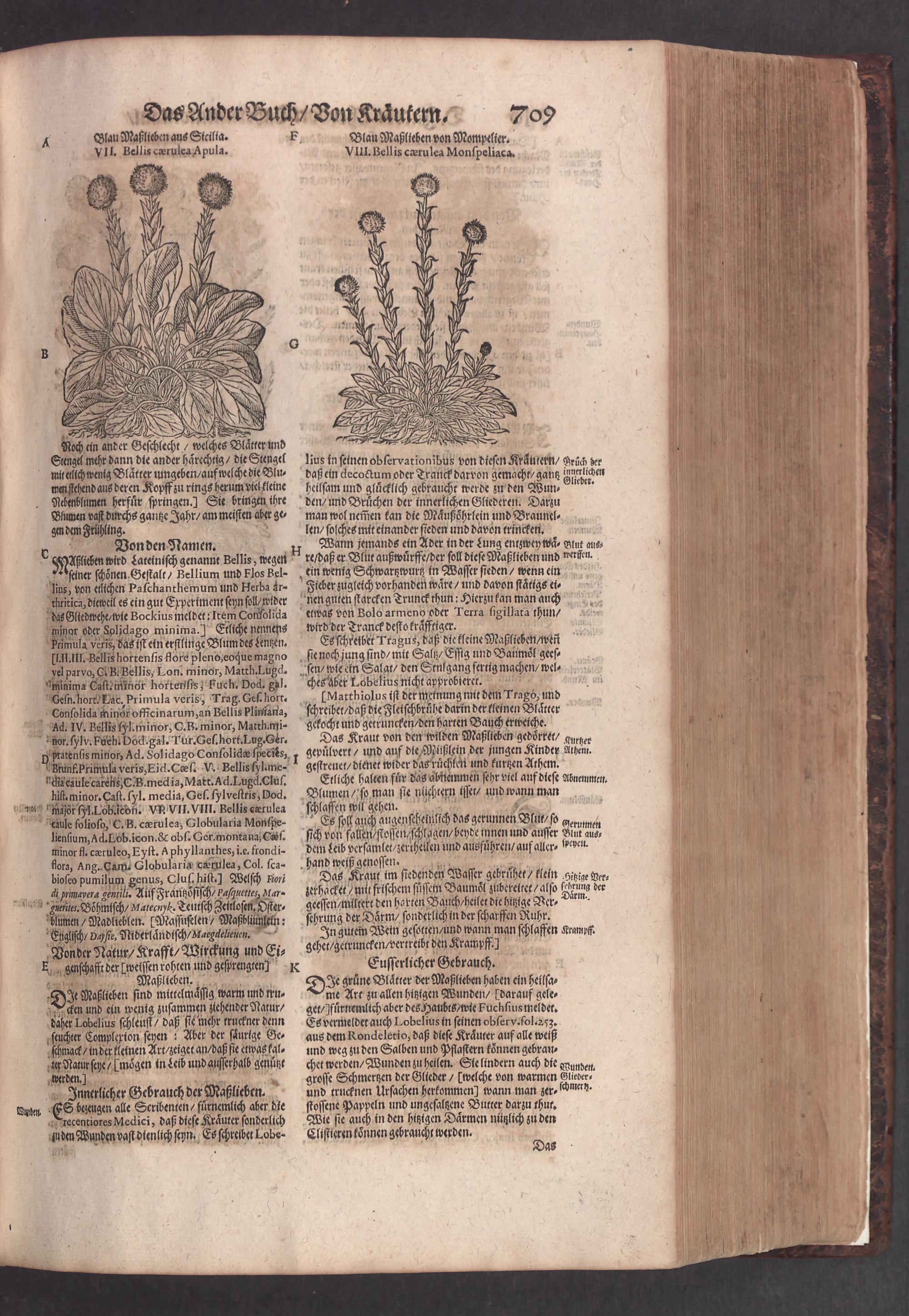 D. Jacobi Theodori Tabernaemontani, Neu vollkommen Kräuter-Buch : Darinnen Uber 3000. Kräuter/ mit schönen und kunstlichen Figuren/ auch deren Underscheid und Würckung/ samt ihren Namen in mancherley Sprachen/ beschrieben: Desgleichen auch/ wie dieselbige in allerhand Kranckheiten/ beyde der Menschen und des Viehs/ sollen angewendet und gebraucht werden/ angezeigt wird. Erstlichen durch Casparum Bauhinum D. und Profess. Basil. mit vielen neuen Figuren/ nutzlichen Artzneyen/ und anderem/ mit sonderem Fleis gebesseret/ Zum Andern Durch Hieronymum Bauhinum D. und Profess. Basil. mit sehr nutzlichen Marginalien, Synonimis, neuen Registeren und anderem vermehrt