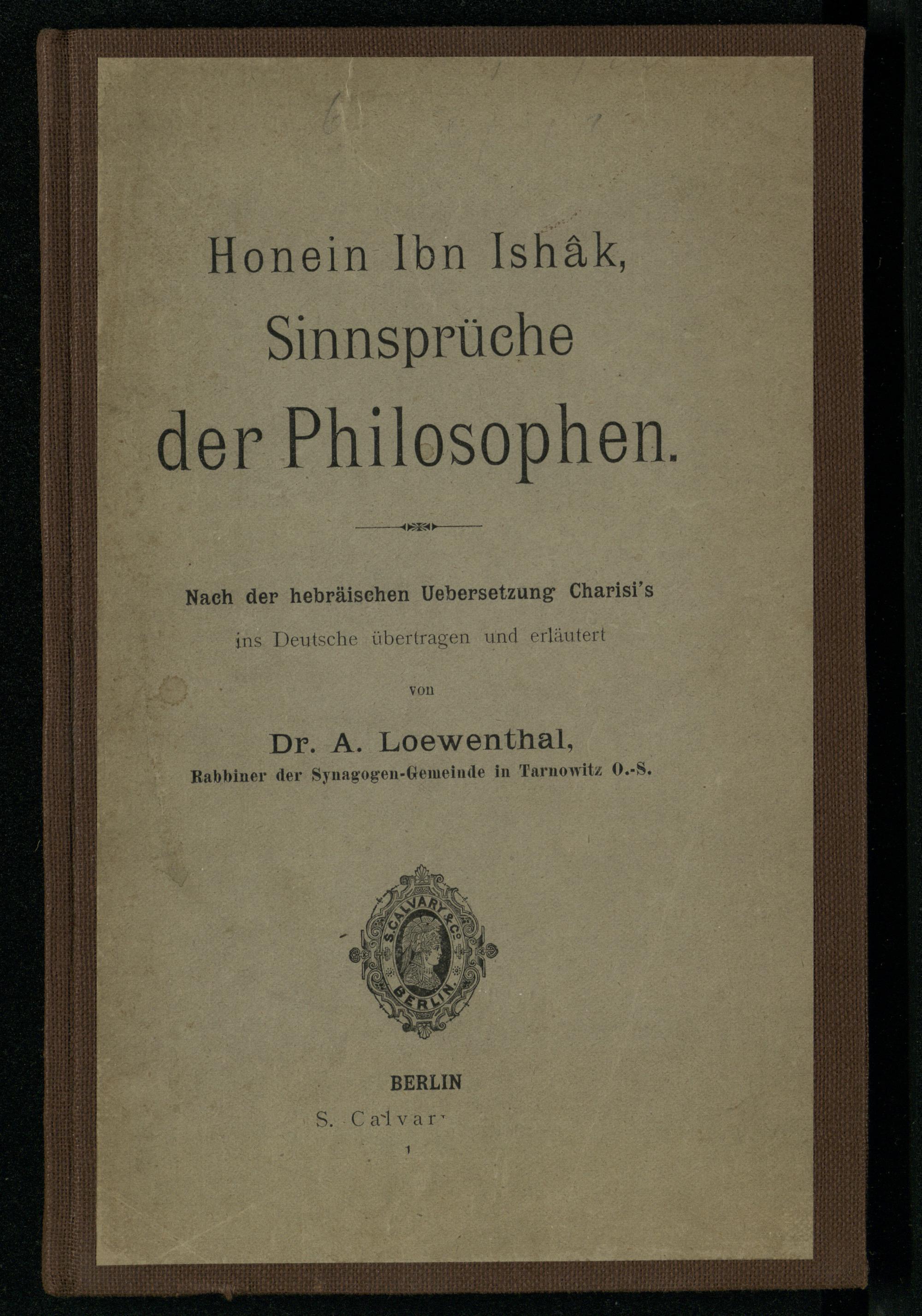 Honein Ibn Ishâk, Sinnsprüche der Philosophen / nach der hebr. Übers. Charisi's ins Dt. übertr. und erl. von A. Loewenthal