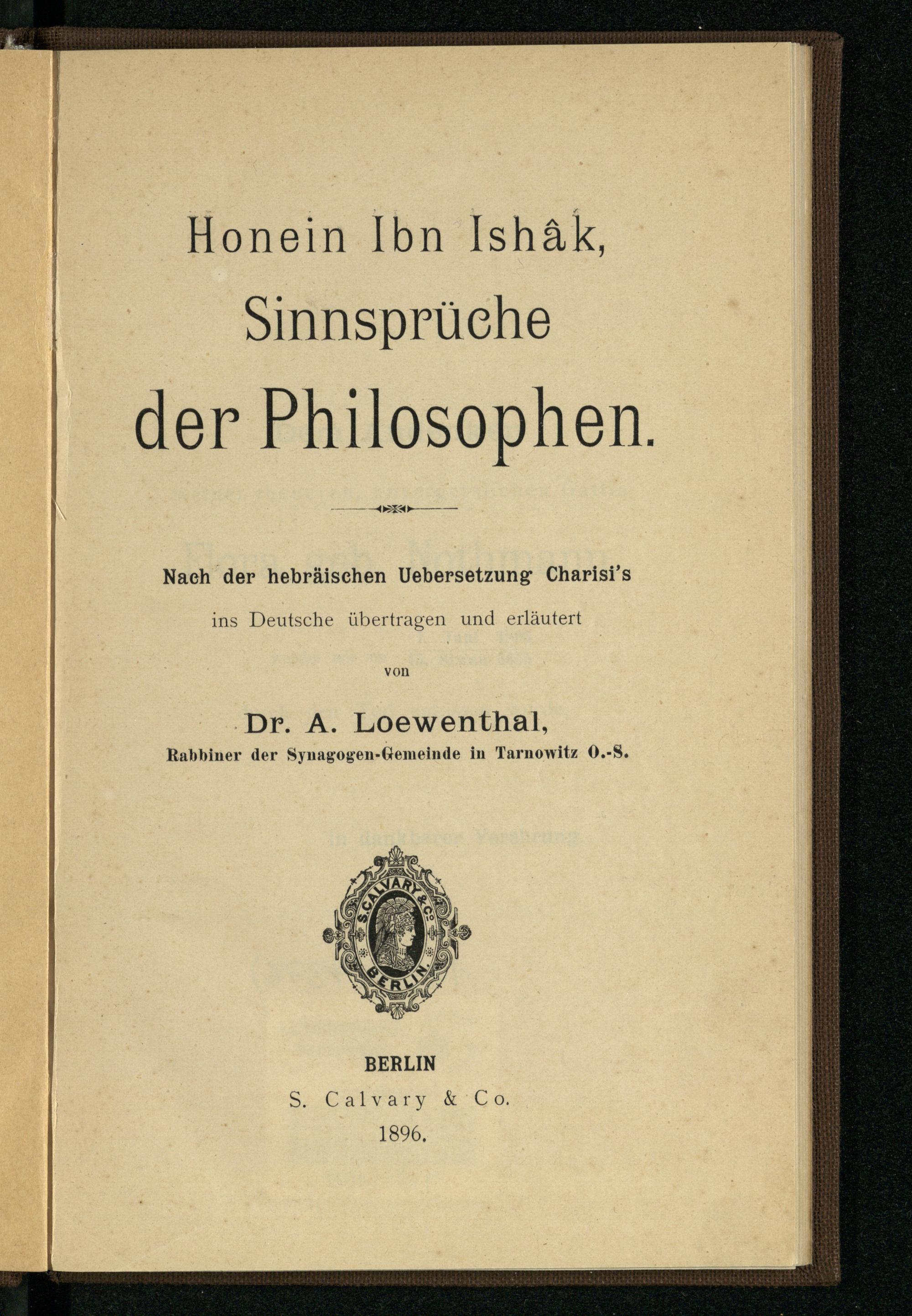 Honein Ibn Ishâk, Sinnsprüche der Philosophen / nach der hebr. Übers. Charisi's ins Dt. übertr. und erl. von A. Loewenthal