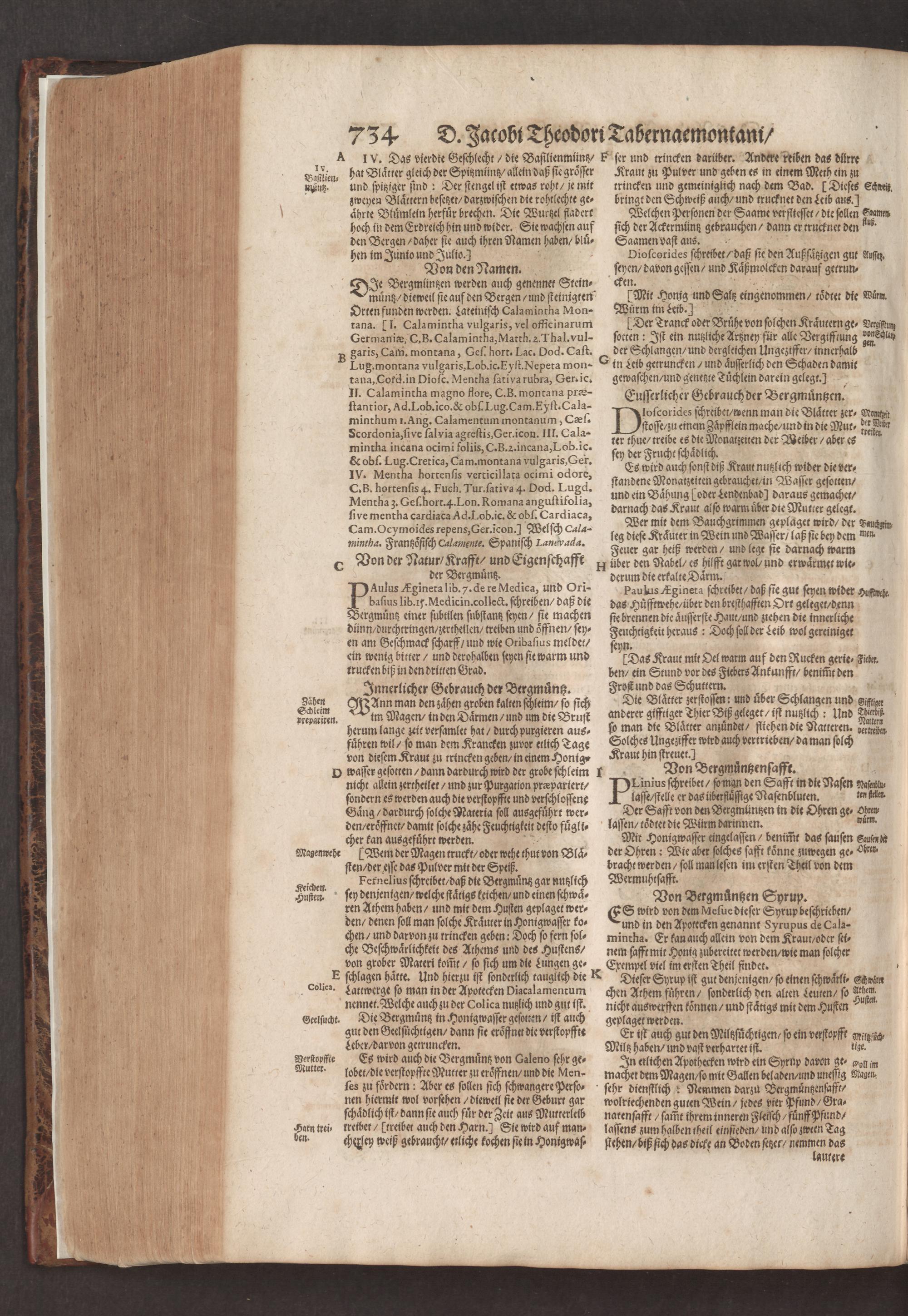 D. Jacobi Theodori Tabernaemontani, Neu vollkommen Kräuter-Buch : Darinnen Uber 3000. Kräuter/ mit schönen und kunstlichen Figuren/ auch deren Underscheid und Würckung/ samt ihren Namen in mancherley Sprachen/ beschrieben: Desgleichen auch/ wie dieselbige in allerhand Kranckheiten/ beyde der Menschen und des Viehs/ sollen angewendet und gebraucht werden/ angezeigt wird. Erstlichen durch Casparum Bauhinum D. und Profess. Basil. mit vielen neuen Figuren/ nutzlichen Artzneyen/ und anderem/ mit sonderem Fleis gebesseret/ Zum Andern Durch Hieronymum Bauhinum D. und Profess. Basil. mit sehr nutzlichen Marginalien, Synonimis, neuen Registeren und anderem vermehrt