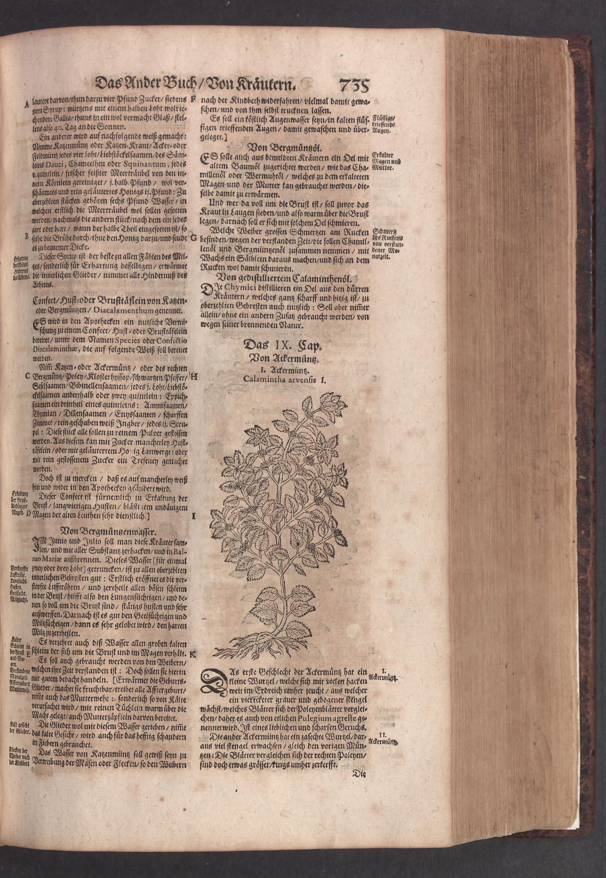 D. Jacobi Theodori Tabernaemontani, Neu vollkommen Kräuter-Buch : Darinnen Uber 3000. Kräuter/ mit schönen und kunstlichen Figuren/ auch deren Underscheid und Würckung/ samt ihren Namen in mancherley Sprachen/ beschrieben: Desgleichen auch/ wie dieselbige in allerhand Kranckheiten/ beyde der Menschen und des Viehs/ sollen angewendet und gebraucht werden/ angezeigt wird. Erstlichen durch Casparum Bauhinum D. und Profess. Basil. mit vielen neuen Figuren/ nutzlichen Artzneyen/ und anderem/ mit sonderem Fleis gebesseret/ Zum Andern Durch Hieronymum Bauhinum D. und Profess. Basil. mit sehr nutzlichen Marginalien, Synonimis, neuen Registeren und anderem vermehrt