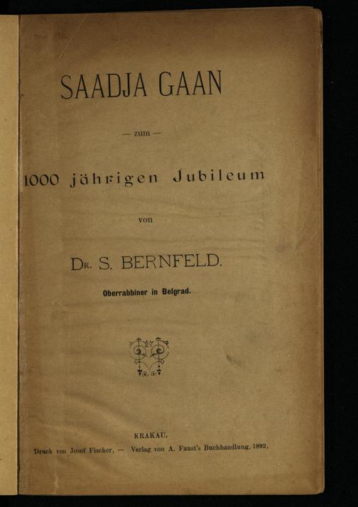 Rabenu Saʿadyah gaʾon : (li-melot elef shanah li-shenat huladto) / meʾet Shimʿon Bernfeld, rav ha-kolel be-Bilogradoרבנו סעדיה גאון : למלאת אלף שנה לשנת הלדתו / מאת שמעון בירנפילד, רב הכולל בבילוגרדו