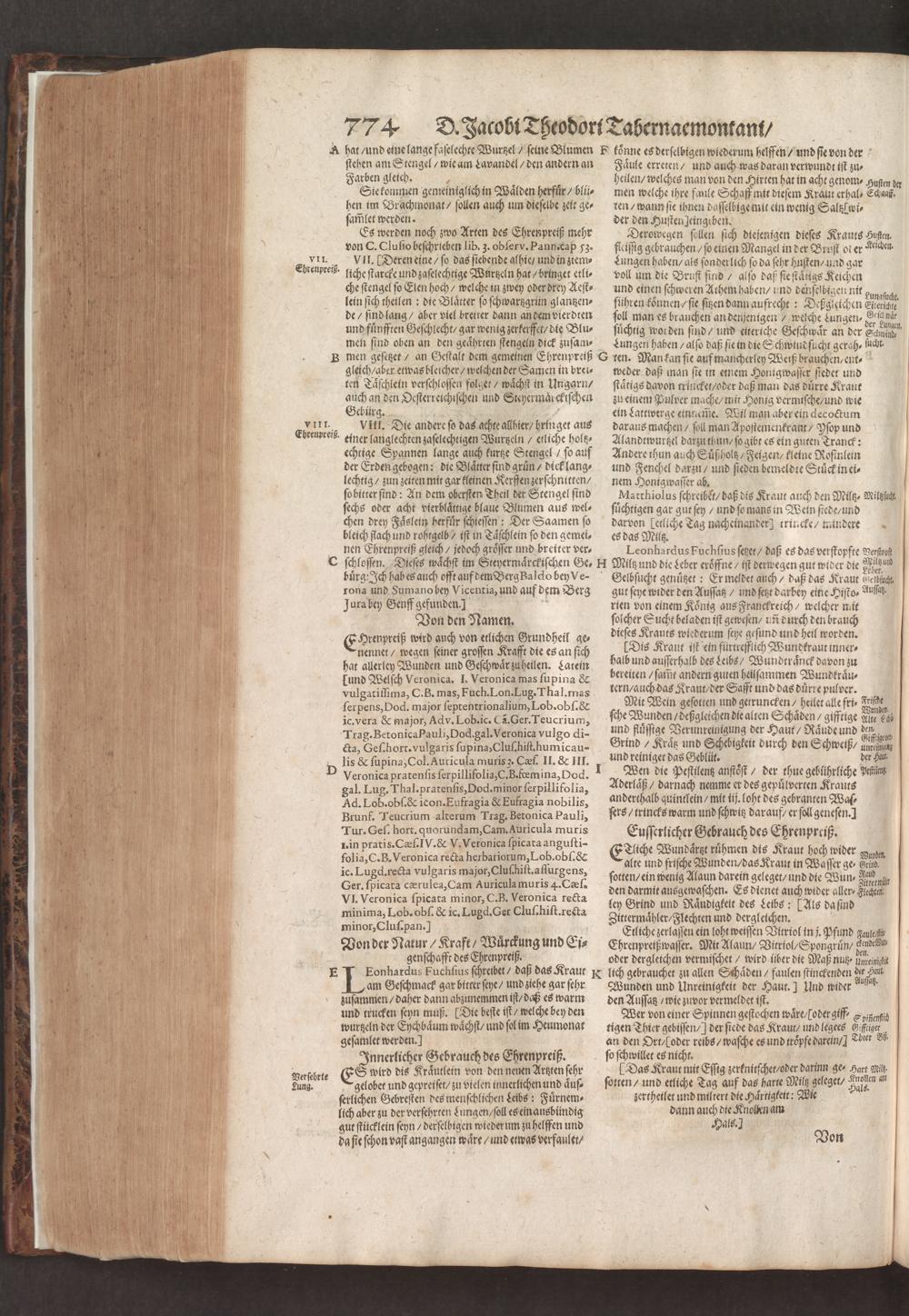 D. Jacobi Theodori Tabernaemontani, Neu vollkommen Kräuter-Buch : Darinnen Uber 3000. Kräuter/ mit schönen und kunstlichen Figuren/ auch deren Underscheid und Würckung/ samt ihren Namen in mancherley Sprachen/ beschrieben: Desgleichen auch/ wie dieselbige in allerhand Kranckheiten/ beyde der Menschen und des Viehs/ sollen angewendet und gebraucht werden/ angezeigt wird. Erstlichen durch Casparum Bauhinum D. und Profess. Basil. mit vielen neuen Figuren/ nutzlichen Artzneyen/ und anderem/ mit sonderem Fleis gebesseret/ Zum Andern Durch Hieronymum Bauhinum D. und Profess. Basil. mit sehr nutzlichen Marginalien, Synonimis, neuen Registeren und anderem vermehrt