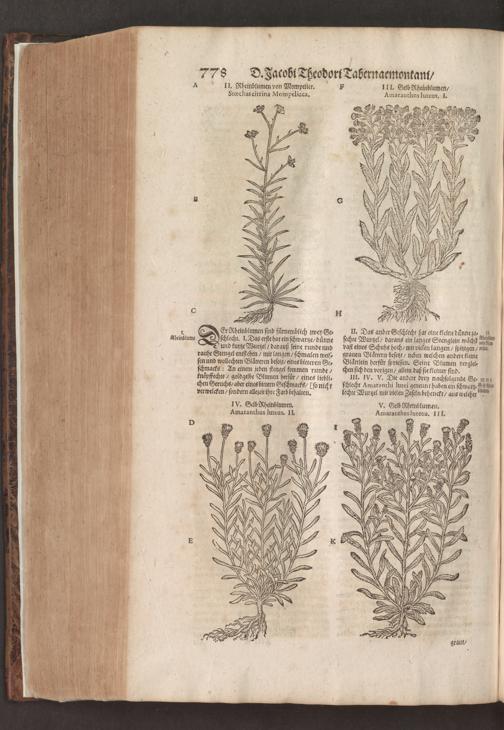 D. Jacobi Theodori Tabernaemontani, Neu vollkommen Kräuter-Buch : Darinnen Uber 3000. Kräuter/ mit schönen und kunstlichen Figuren/ auch deren Underscheid und Würckung/ samt ihren Namen in mancherley Sprachen/ beschrieben: Desgleichen auch/ wie dieselbige in allerhand Kranckheiten/ beyde der Menschen und des Viehs/ sollen angewendet und gebraucht werden/ angezeigt wird. Erstlichen durch Casparum Bauhinum D. und Profess. Basil. mit vielen neuen Figuren/ nutzlichen Artzneyen/ und anderem/ mit sonderem Fleis gebesseret/ Zum Andern Durch Hieronymum Bauhinum D. und Profess. Basil. mit sehr nutzlichen Marginalien, Synonimis, neuen Registeren und anderem vermehrt